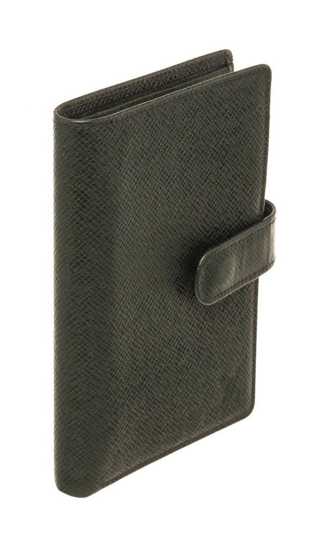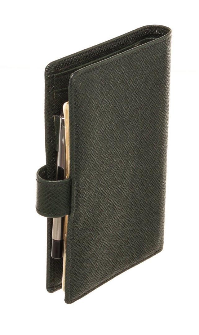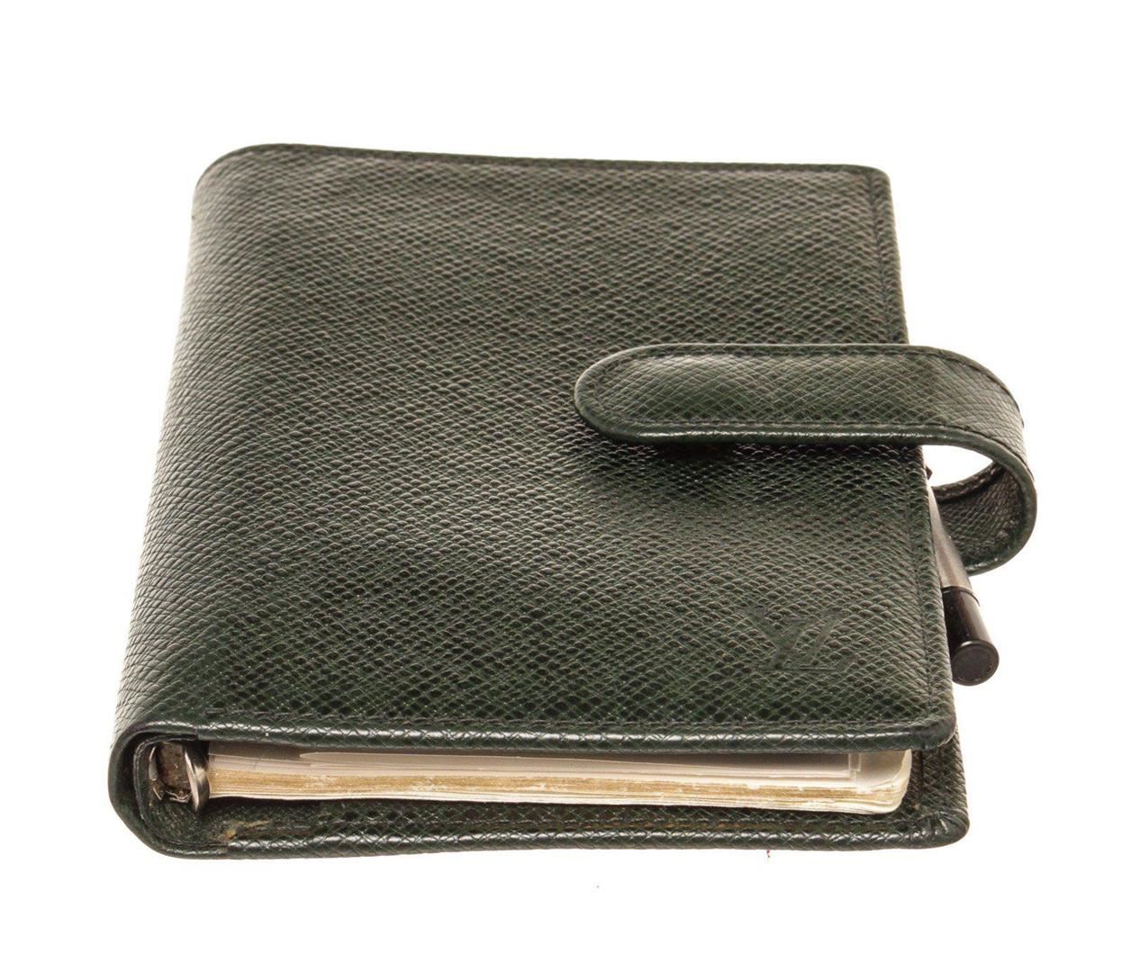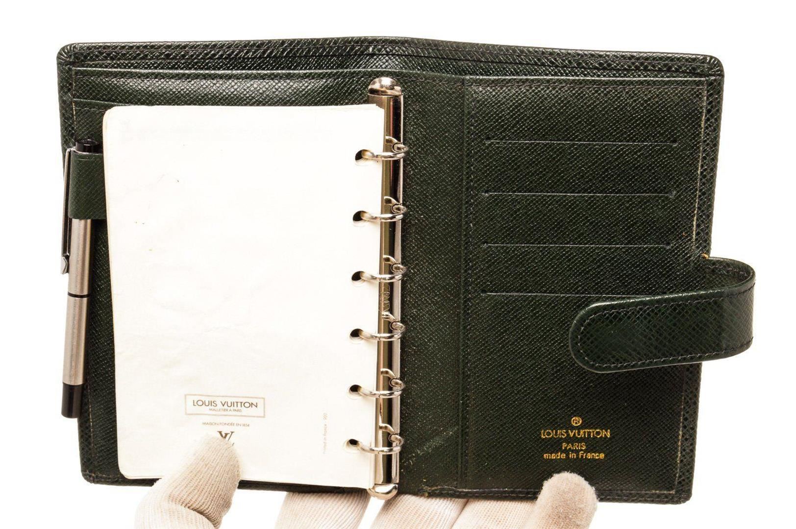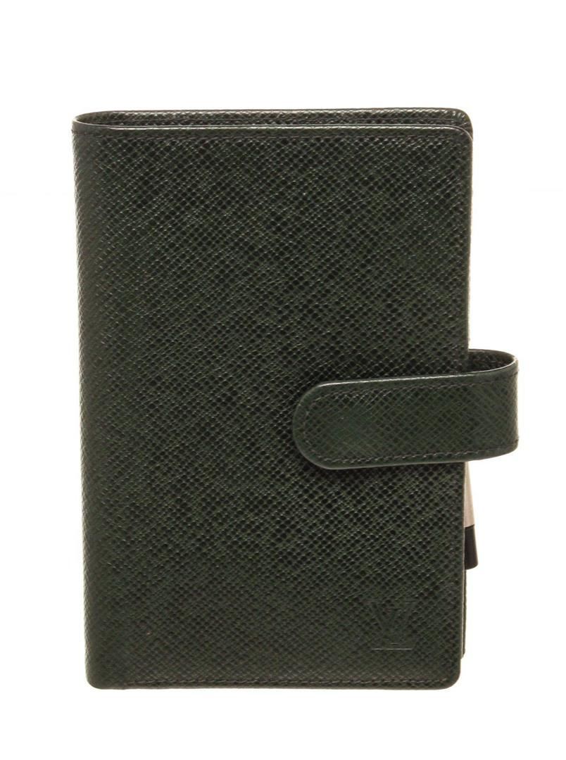 Louis Vuitton Green Taiga Leather Agenda PM Wallet with leather, gold-tone hardware, trim tan vachetta, interior three compartments pocket and snap closure.