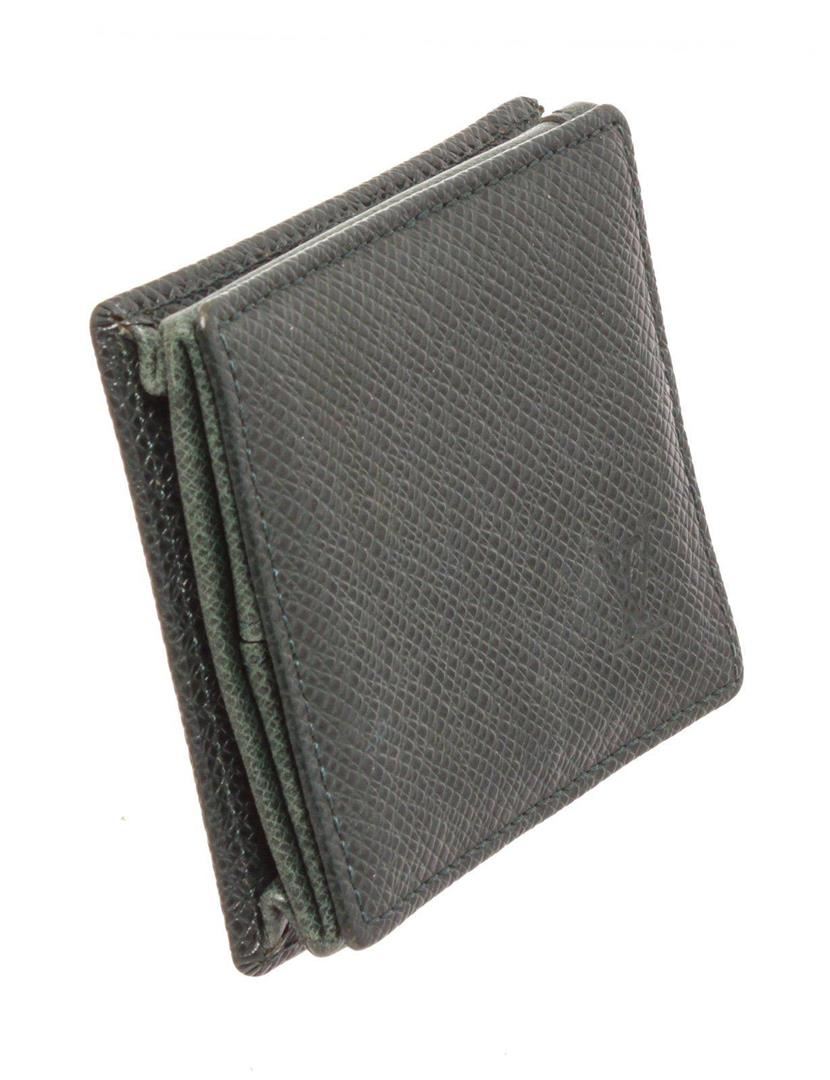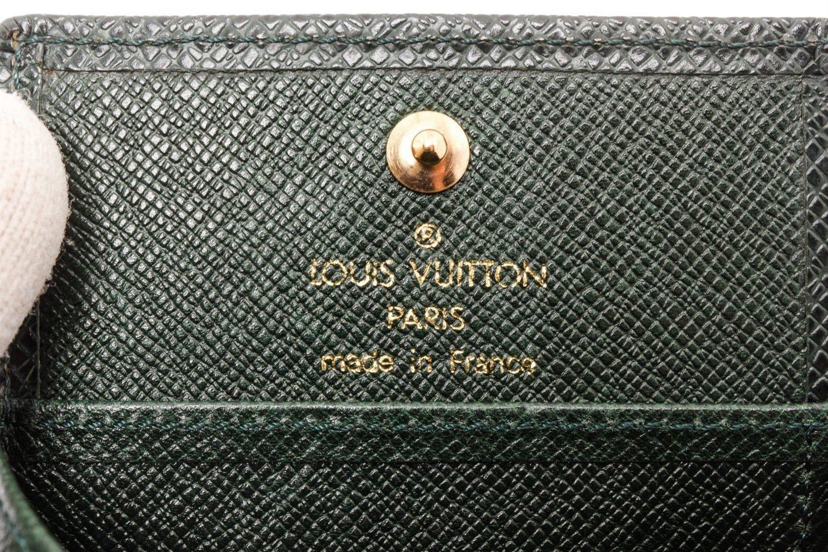 Louis Vuitton Green Taiga Leather Boite Coin Case Wallet with gold-tone hardware, embellishments embossed logo, tonal taiga lining, one open coin compartment and overall snap closure. Measurements: Length: 3 in / 8 cm Width: 0.5 in / 1 cm 3 in / 8 cm Condition: Pre-Owned Good overall, please see photographs for detail.