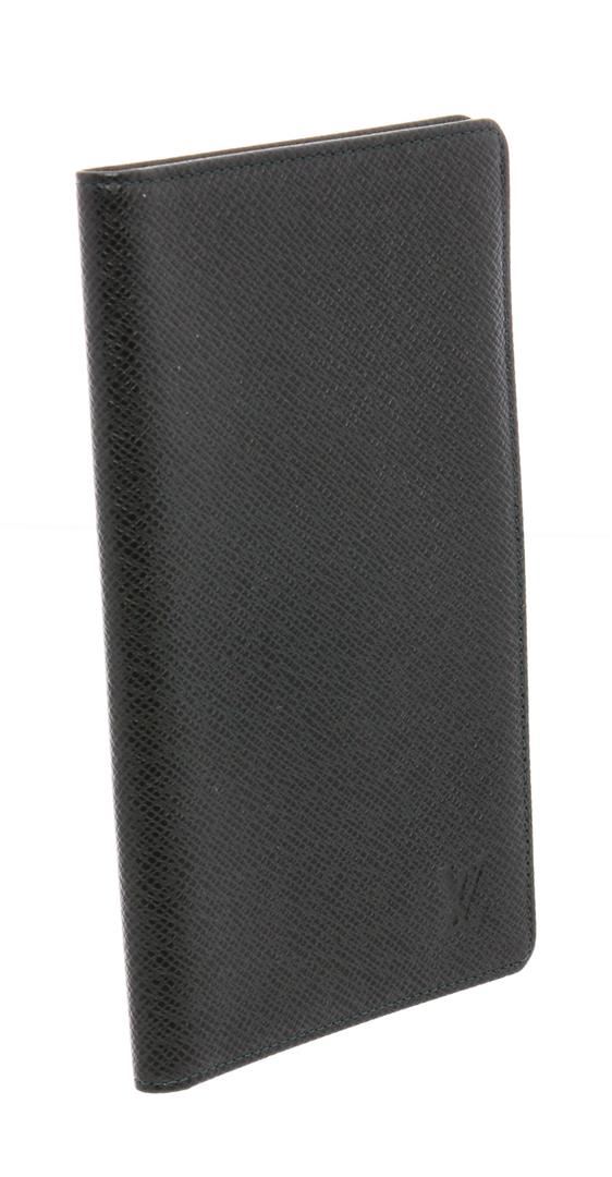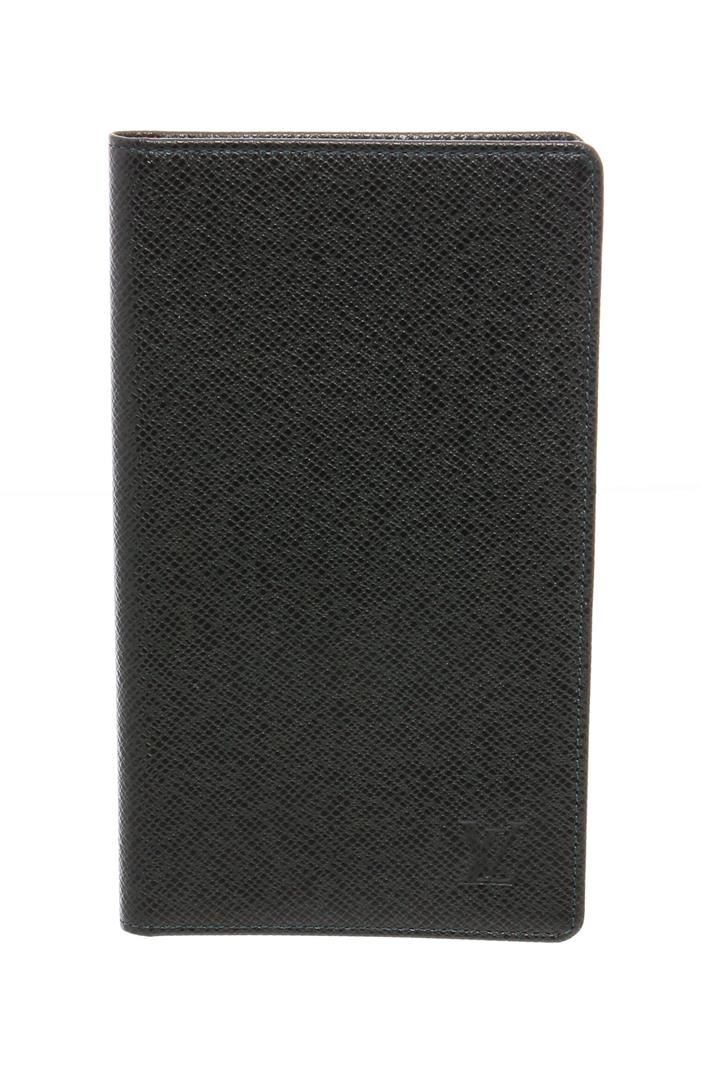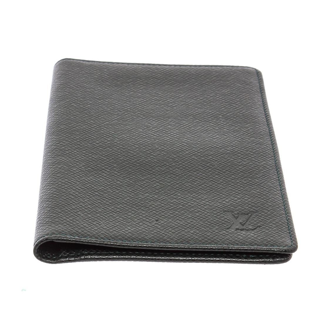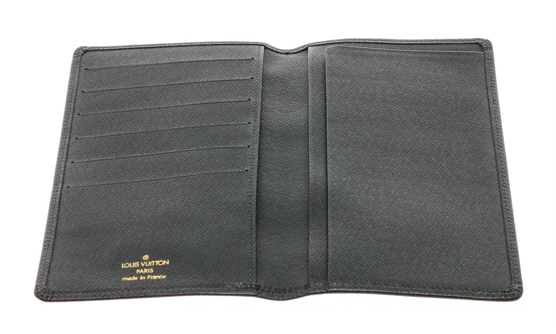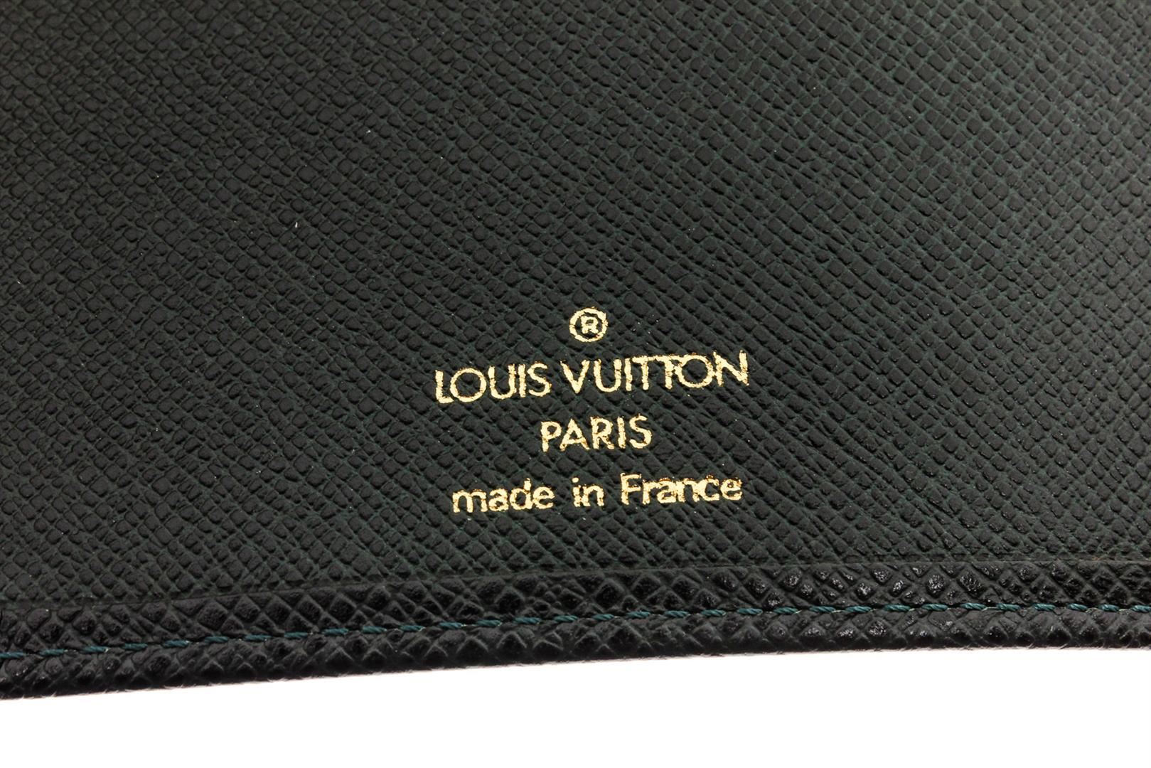 Green Taiga leather Louis Vuitton Checkbook Cover with debossed logo accent at front, tonal Taiga leather lining, foil-stamped logo accent, three interior slit compartments, six card slots and bifold closure.