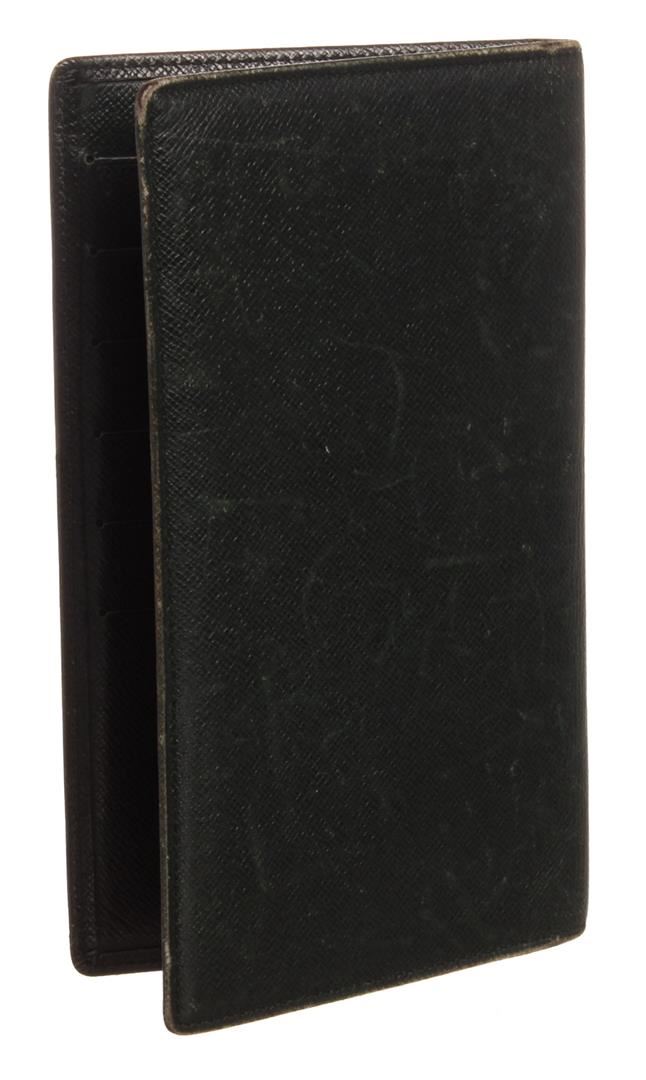 Louis Vuitton dark green Taiga leather Checkbook Organizer Wallet with three side pockets and six card slots, bifold closure.