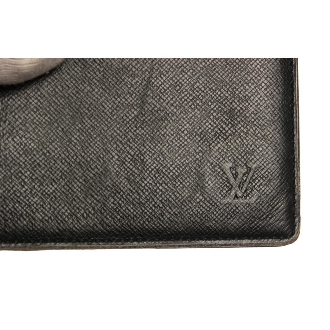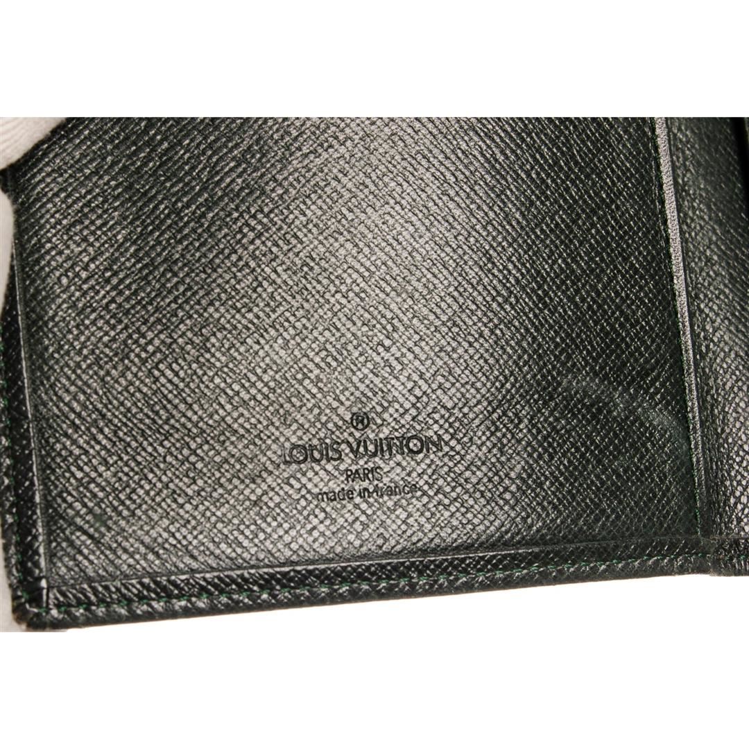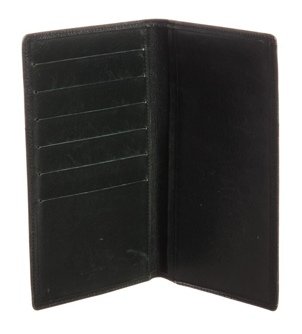 Louis Vuitton dark green Taiga leather Checkbook Organizer Wallet with three side pockets and six card slots, bifold closure.