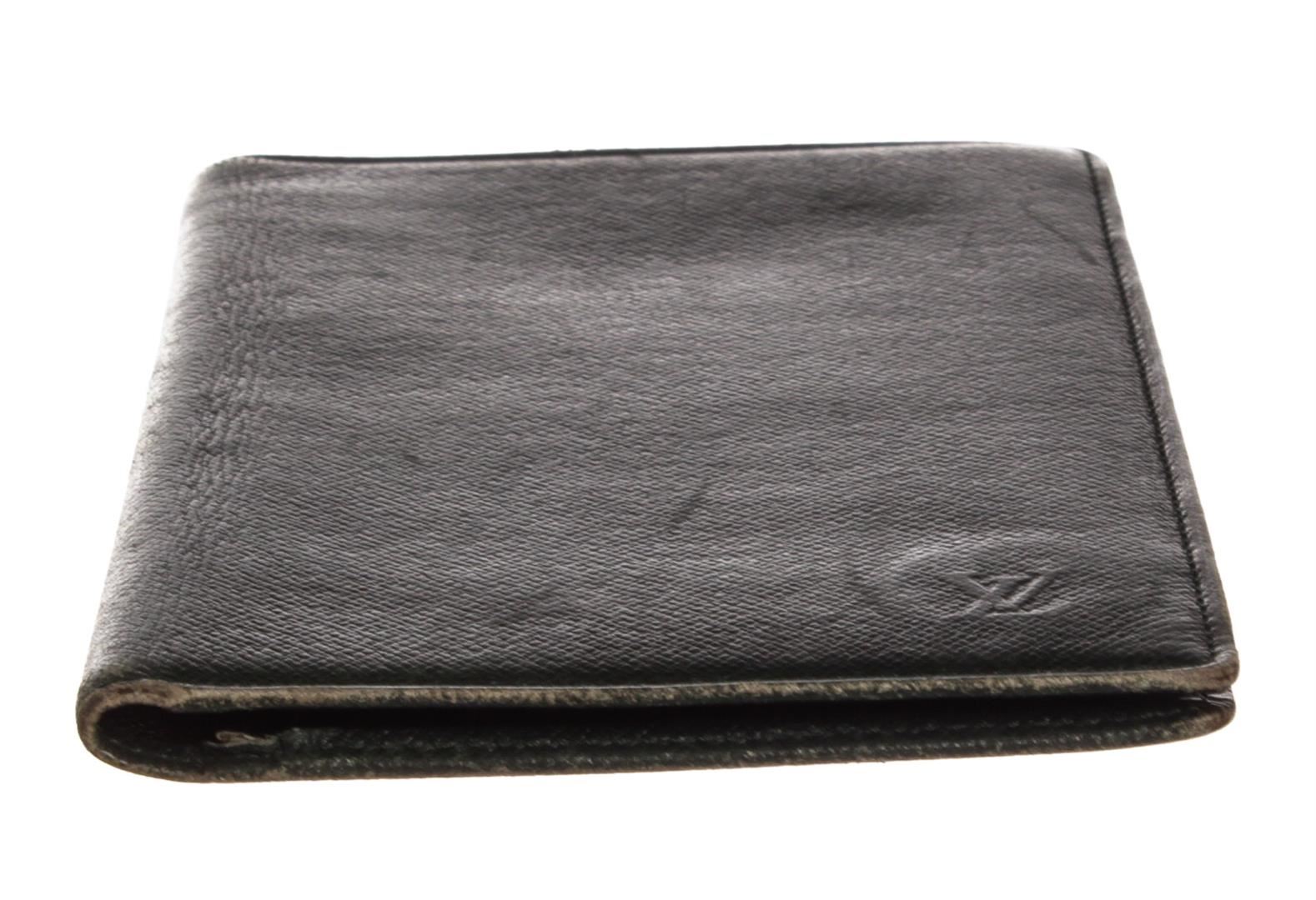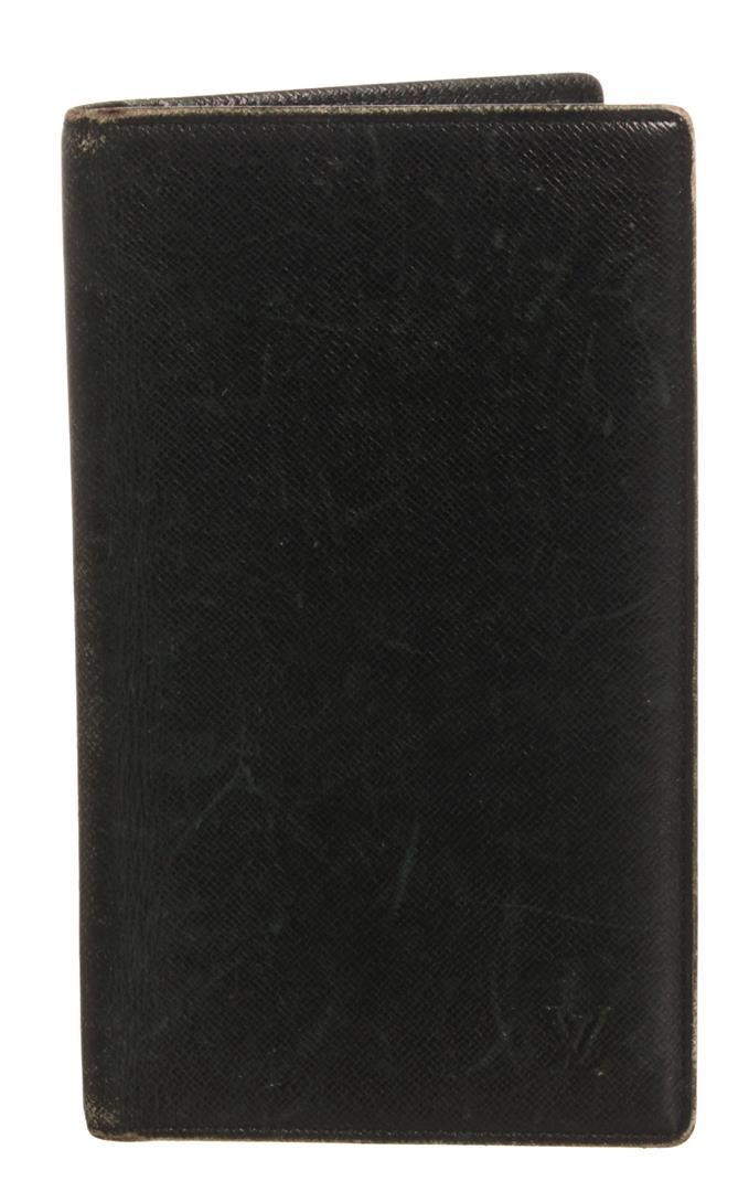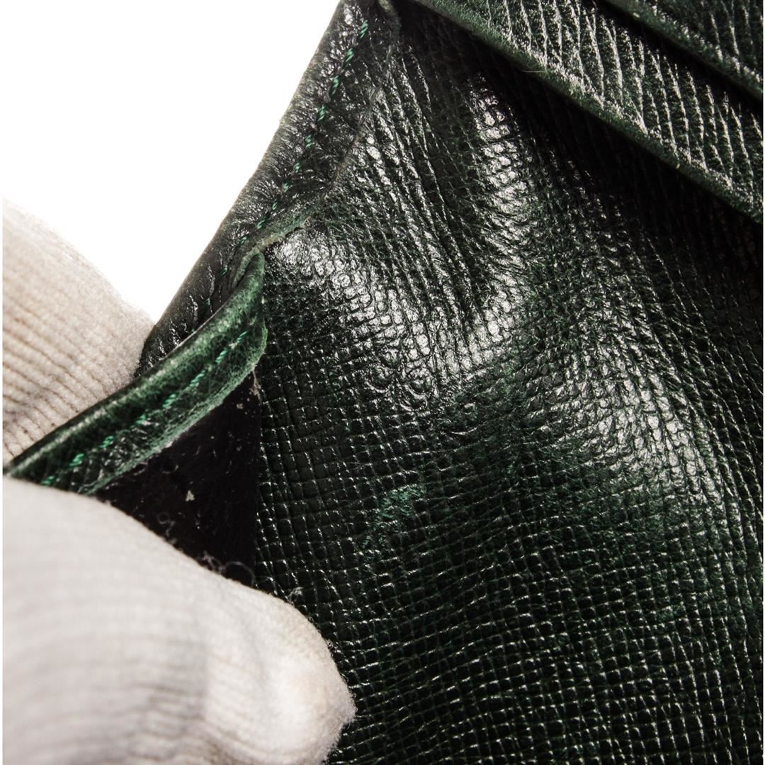 Louis Vuitton dark green Taiga leather Checkbook Organizer Wallet with three side pockets and six card slots, bifold closure.