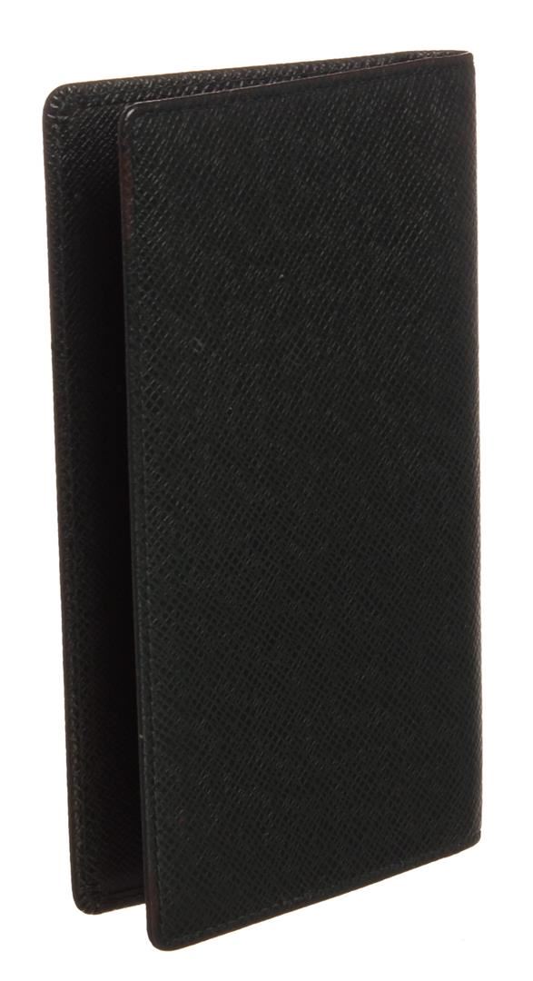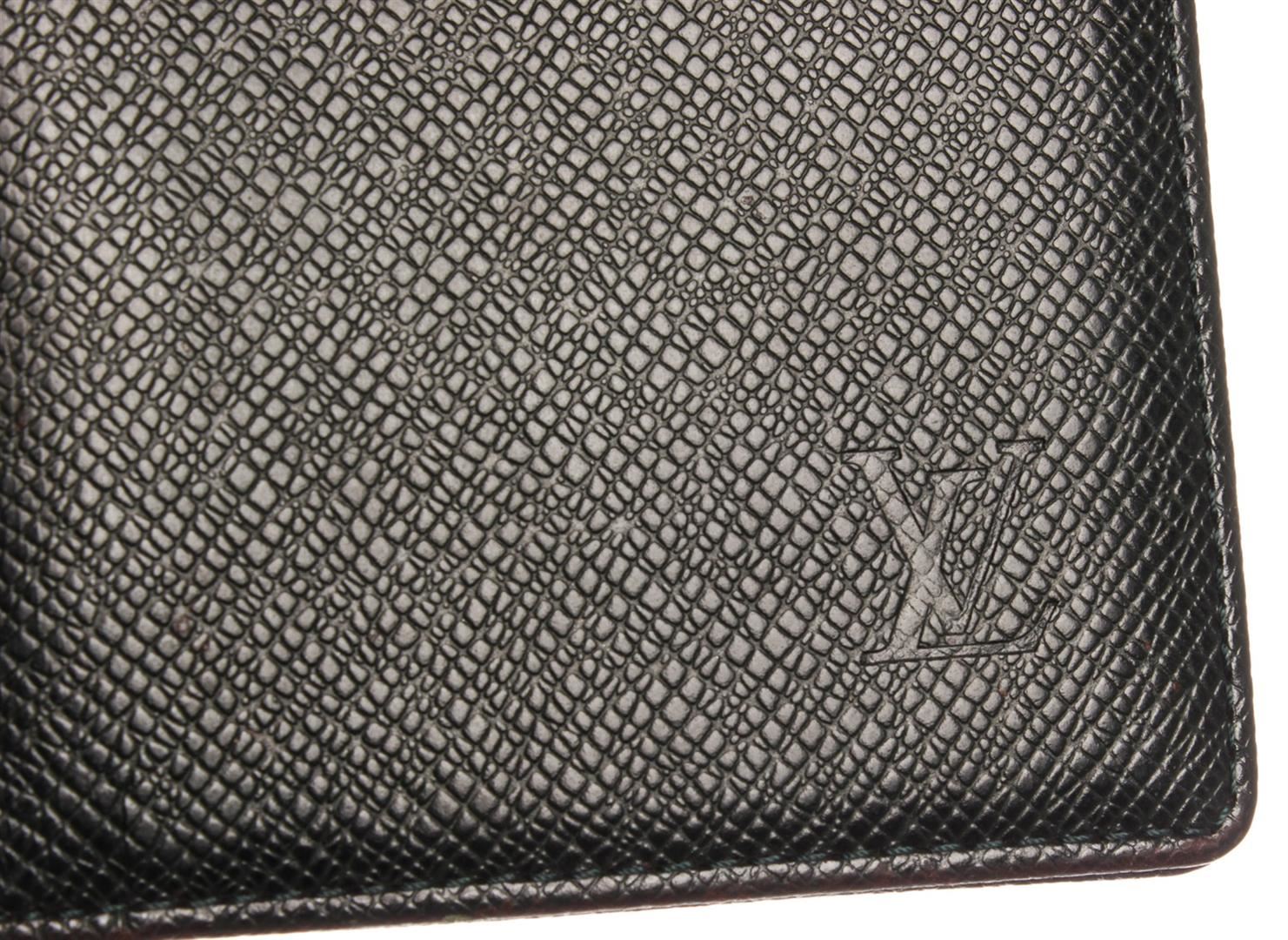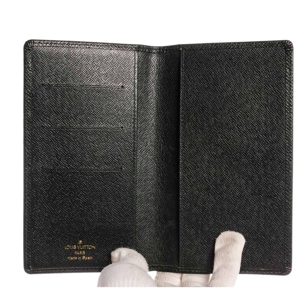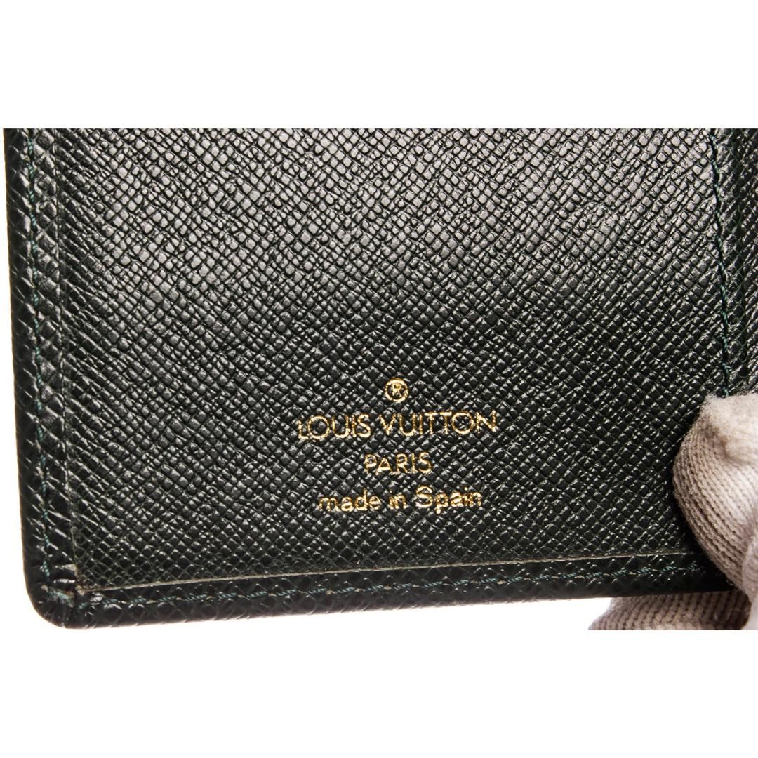 Louis Vuitton dark green Taiga leather Checkbook Wallet with dual side pockets and three card slots, bifold closure.