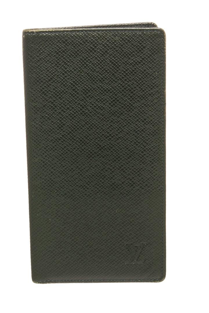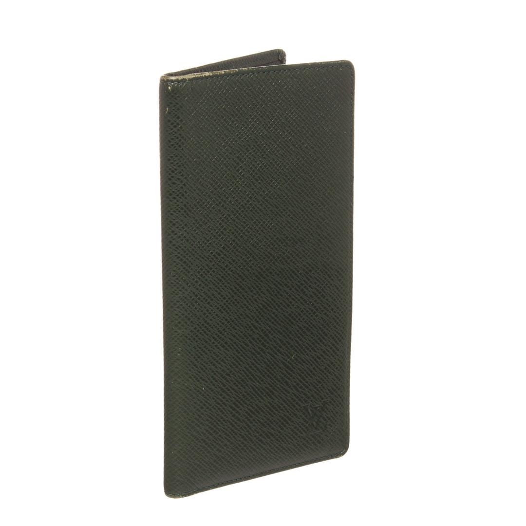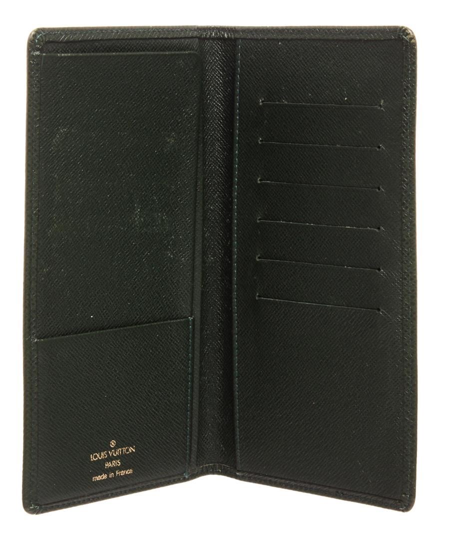 Dark green Taiga leather Louis Vuitton checkbook wallet with tonal leather lining, six card slots, two side slip pockets, open side pocket, and smaller slip pocket.