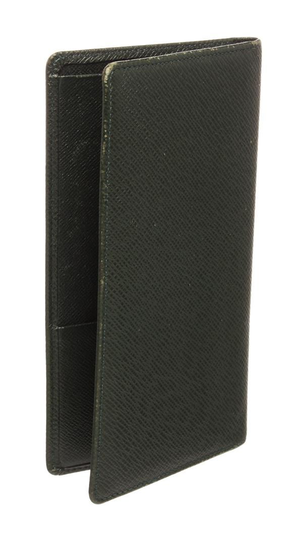 Dark green Taiga leather Louis Vuitton checkbook wallet with tonal leather lining, six card slots, two side slip pockets, open side pocket, and smaller slip pocket.