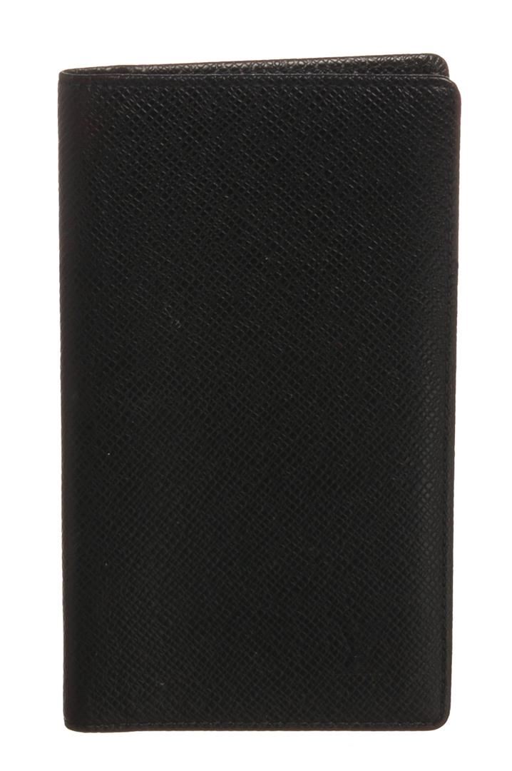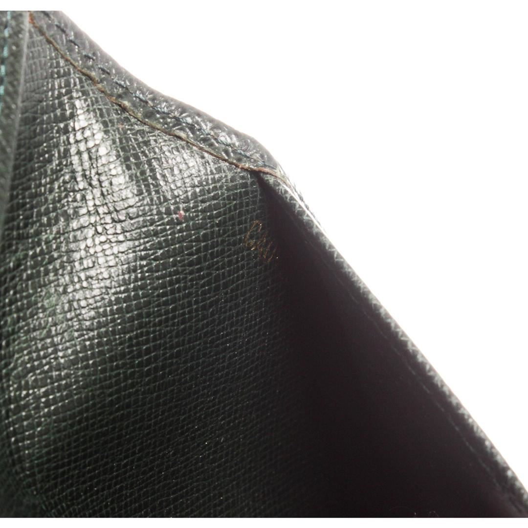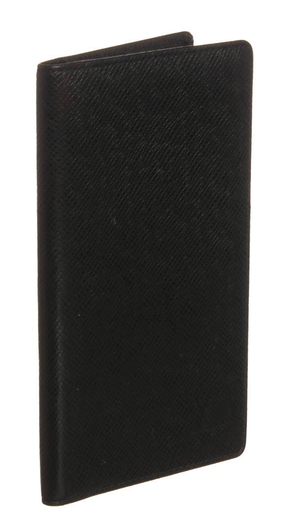 Louis Vuitton dark green Taiga leather Checkbook Wallet with dual side pockets and three card slots, bifold closure.