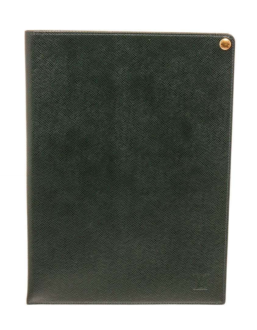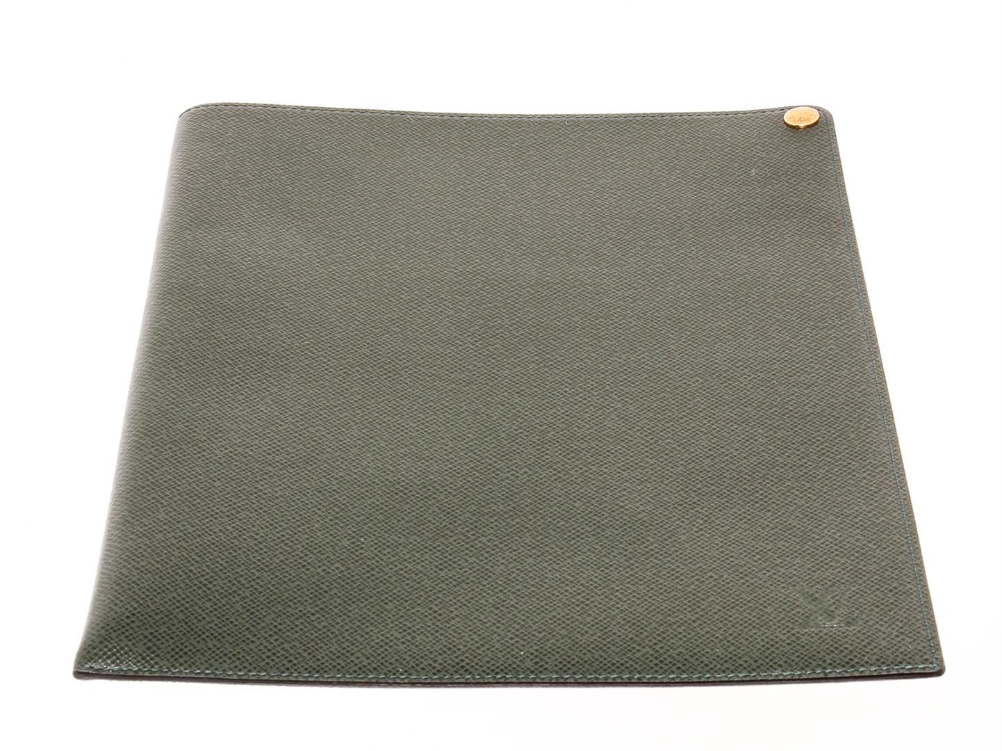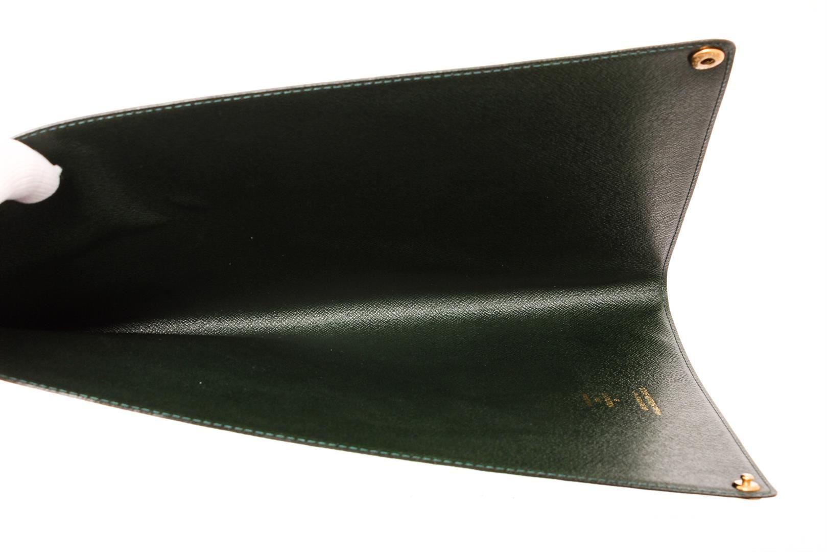 Louis Vuitton green taiga leather document folder with gold-toned hardware, green leather interior and overall snap closure at top.