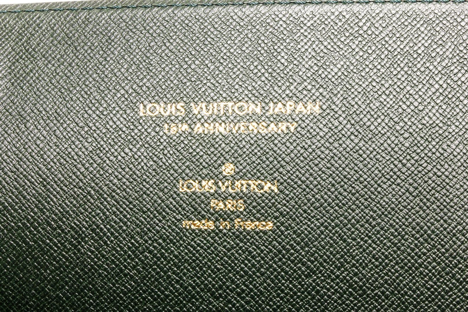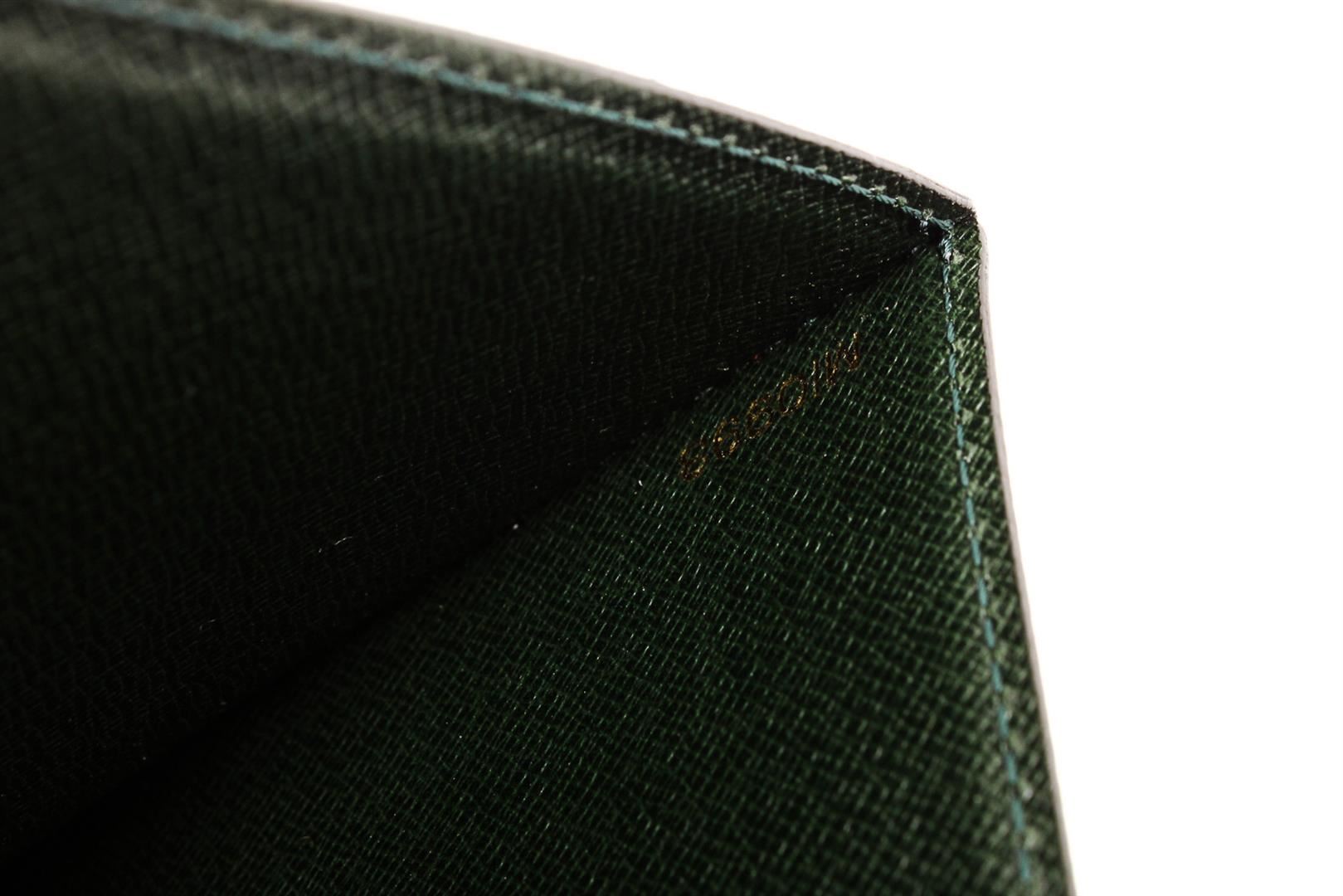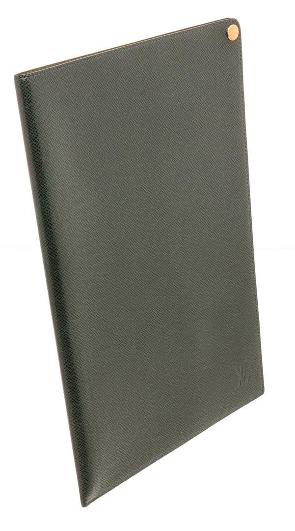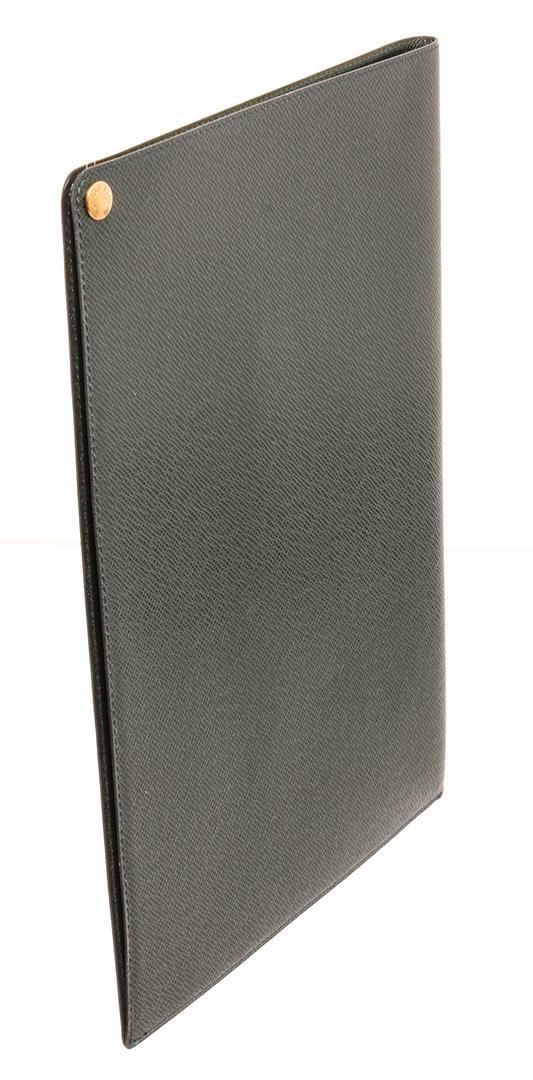 Louis Vuitton green taiga leather document folder with gold-toned hardware, green leather interior and overall snap closure at top.