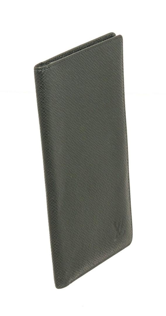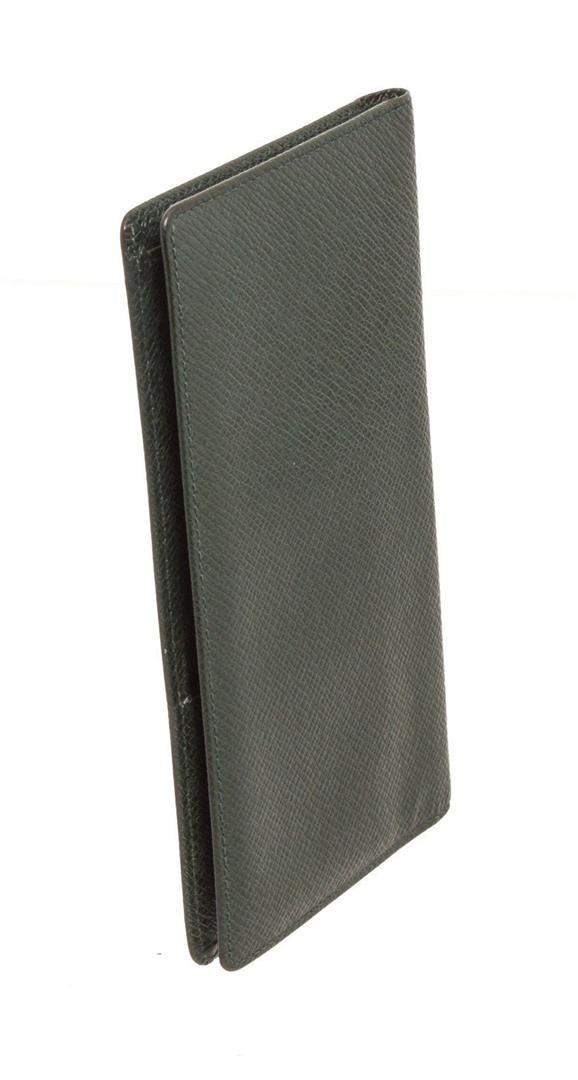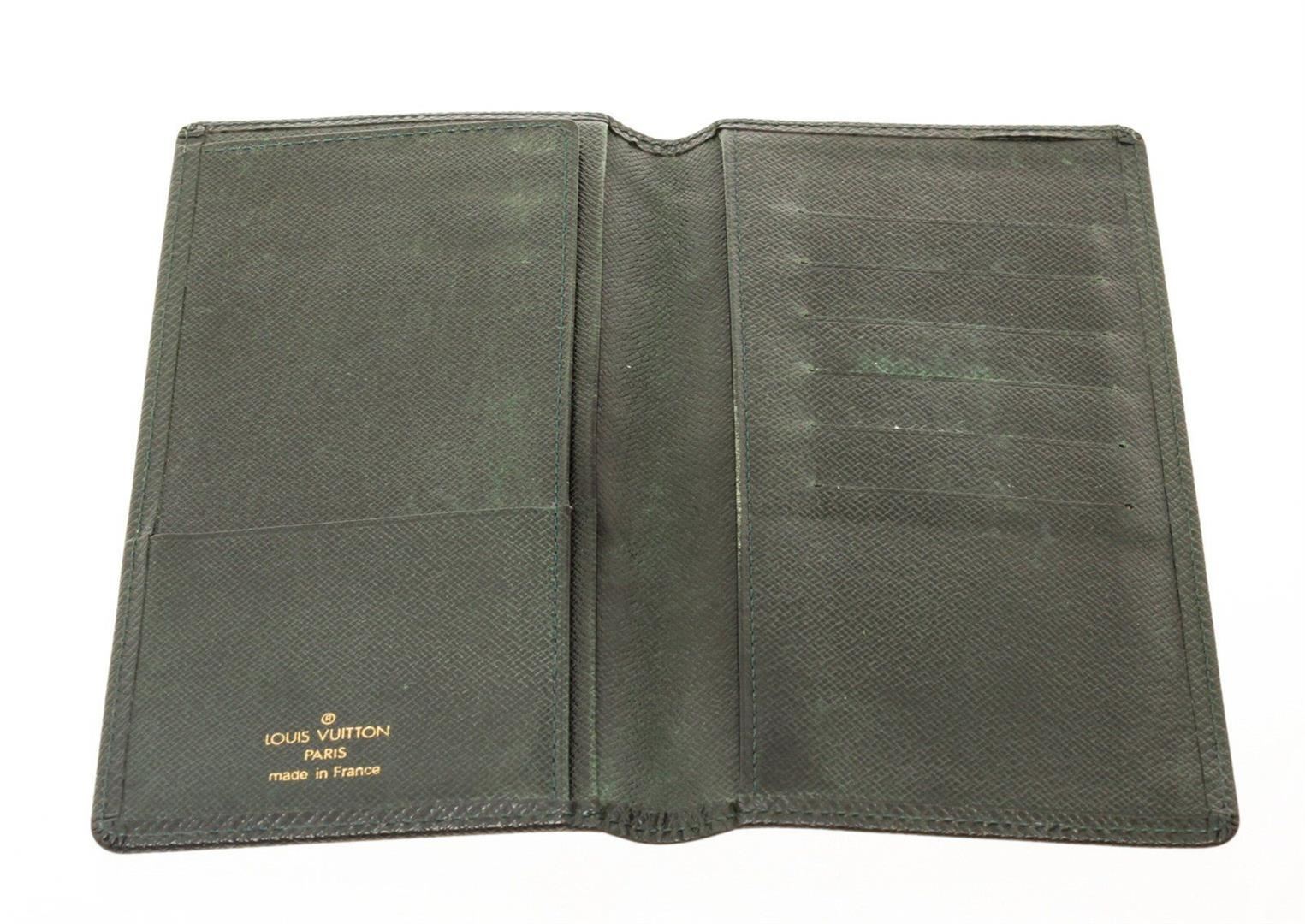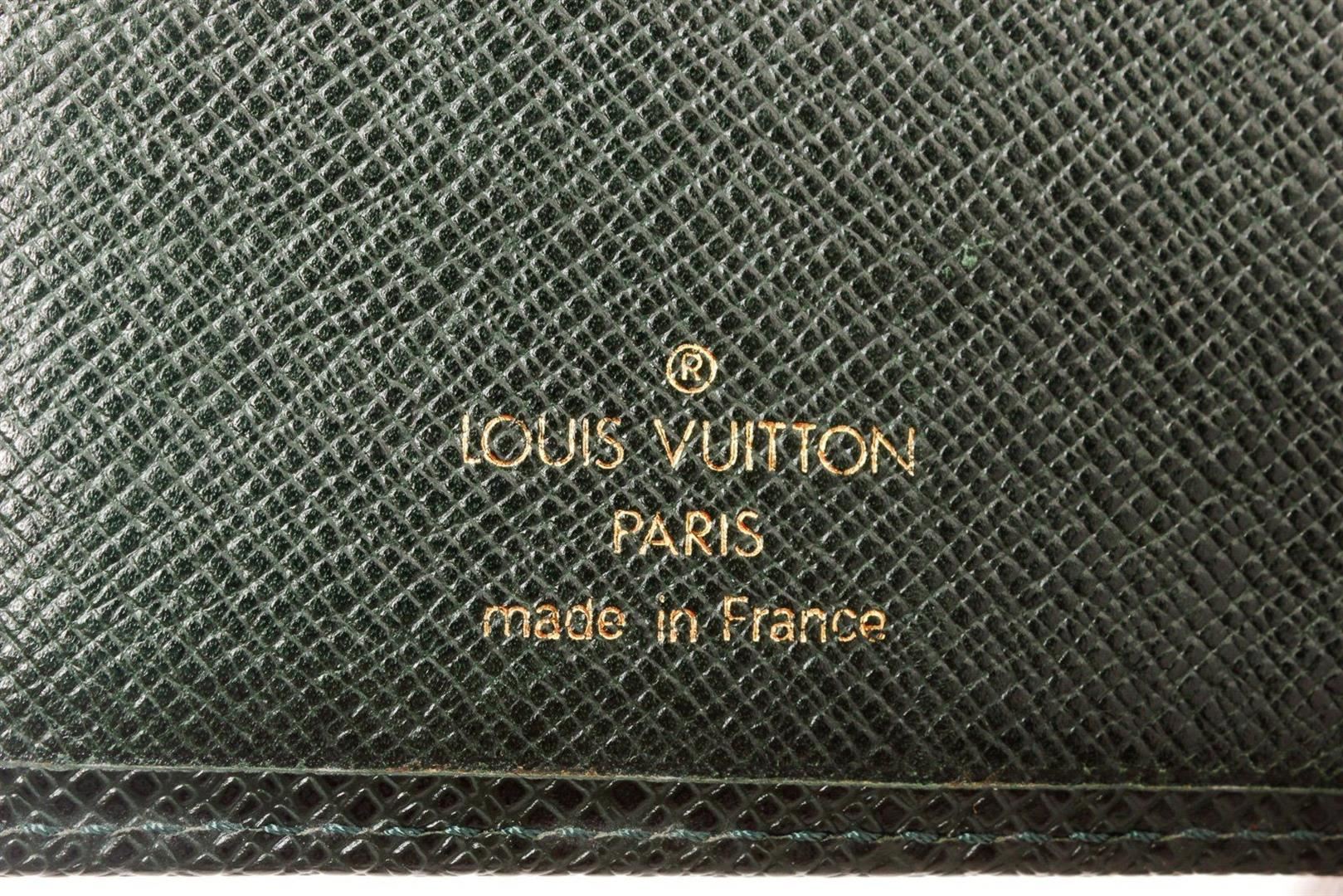 Louis Vuitton Green Taiga Leather Long Card Wallet with gold-tone hardware, any debossed logo embellishments, interior slip pockets, taiga leather lining, and bifold closure.