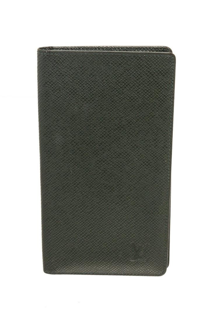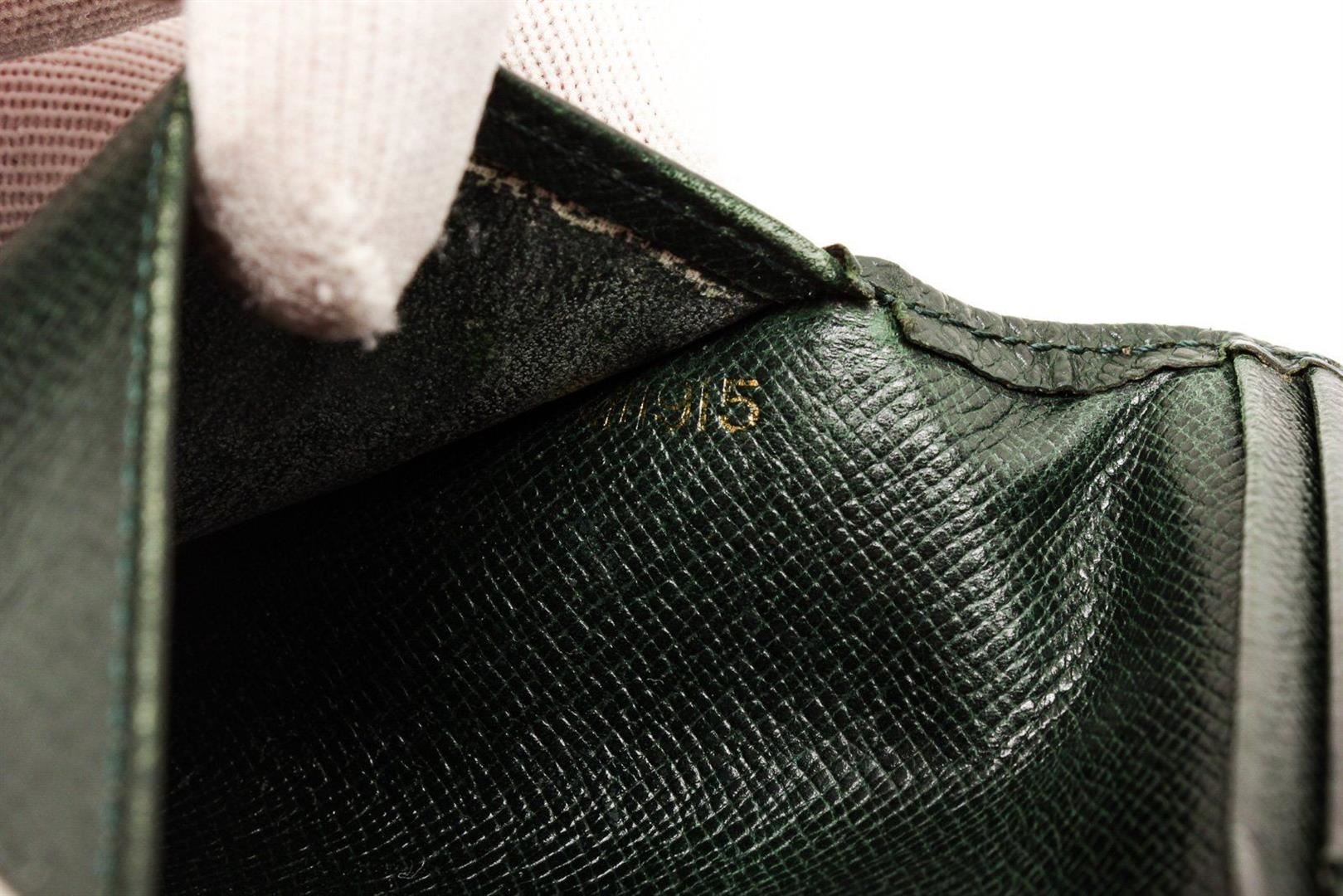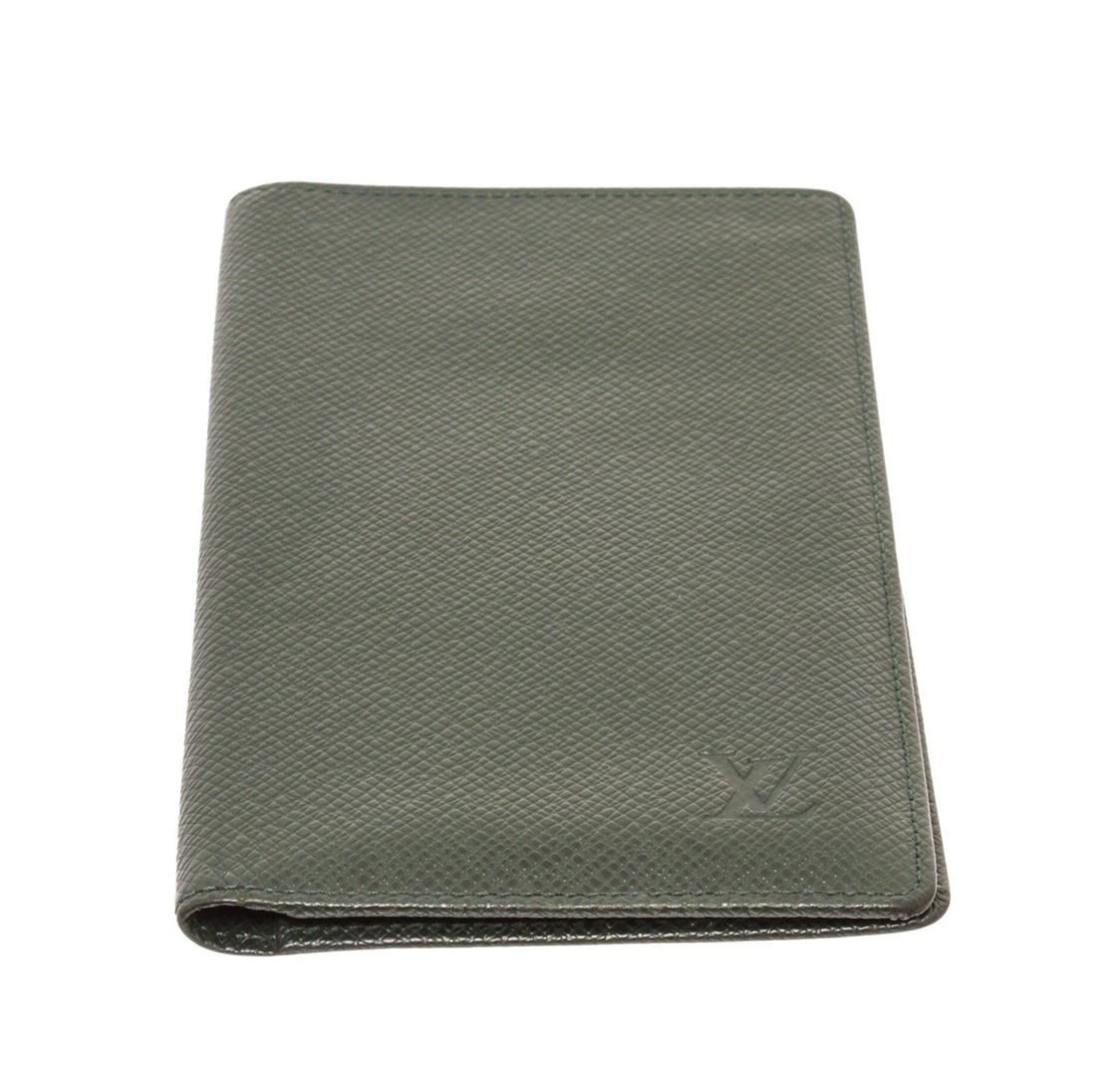 Louis Vuitton Green Taiga Leather Long Card Wallet with gold-tone hardware, any debossed logo embellishments, interior slip pockets, taiga leather lining, and bifold closure.