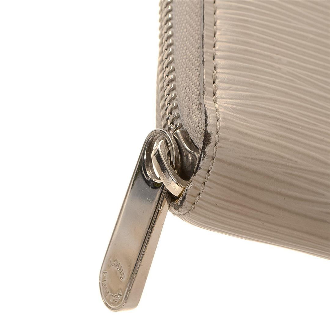 Louis Vuitton Grey Epi Leather Zippy Wallet with grey-tone hardware, epi leather material, trim tan vachetta leather, five interior compartments, interior card slots, leather lining and zipper closure. Measurements: Length: 0.75 in / 2 cm Width: 7.5 in / 19 cm 3.75 in / 10 cm Condition: Pre-Owned Good overall, please see photographs for detail.