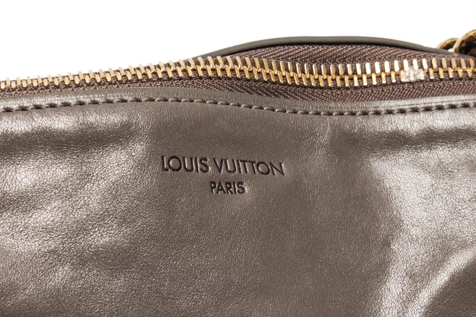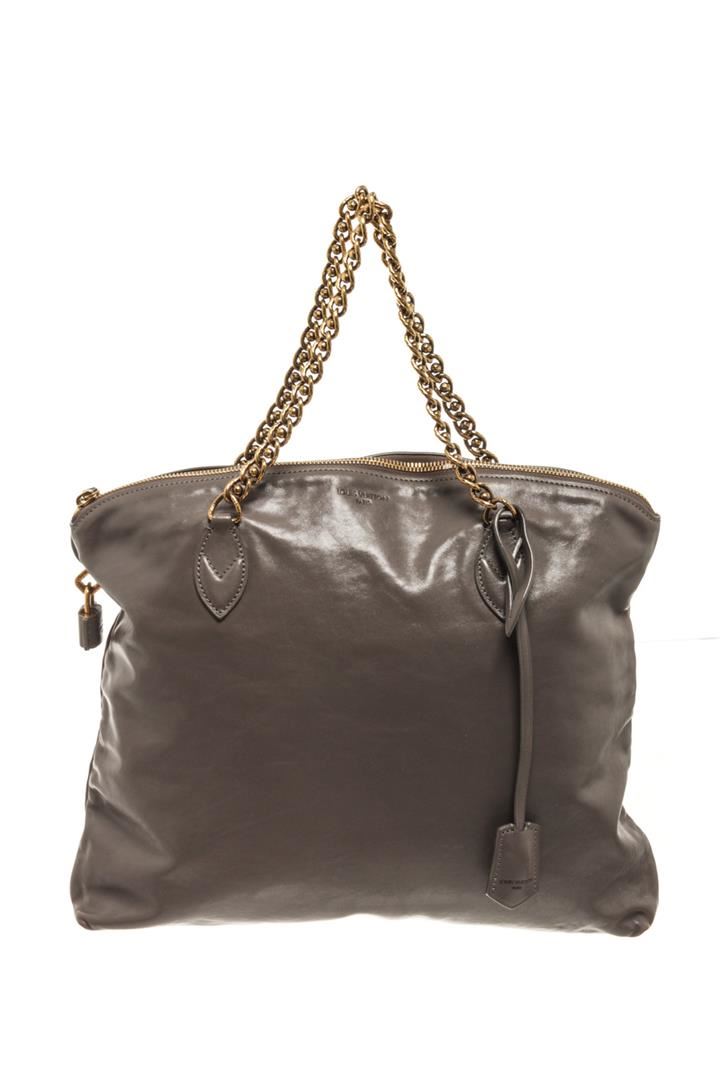 One Louis Vuitton Grey Leather Lockit Chain Shoulder Bag. Item is sold AS-IS. All available information is listed in the description and shown in the photo. louis vuitton grey leather lockit chain shoulder bag with features signature lockit chain strap, side padlock closure, subtle embossed lv logo at its center, and bronze-tone hardware accents. its zip closure opens to a black leather-lined interior with a zip pocket perfect for storing your daily essentials. Height: 12" Width: 13.5" Depth: 2.5", Handle Drop: / 30.48 x 34.29 x 6.35 Cm