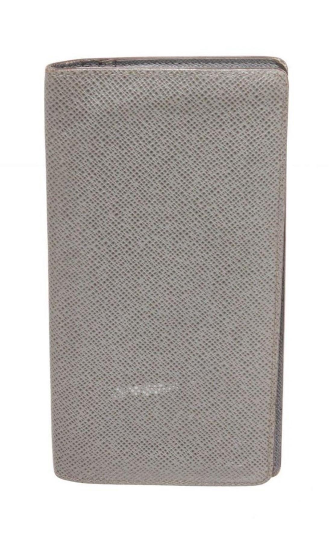 Louis Vuitton Grey Taiga Leather Brazza Wallet. Louis Vuitton Grey Taiga Leather Brazza Wallet with silver-tone hardware, tonal stitching, embossed logo accent at front wall, tonal leather lining, five bill slots, single zip compartment, card slots and bi