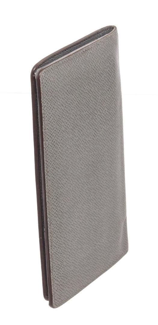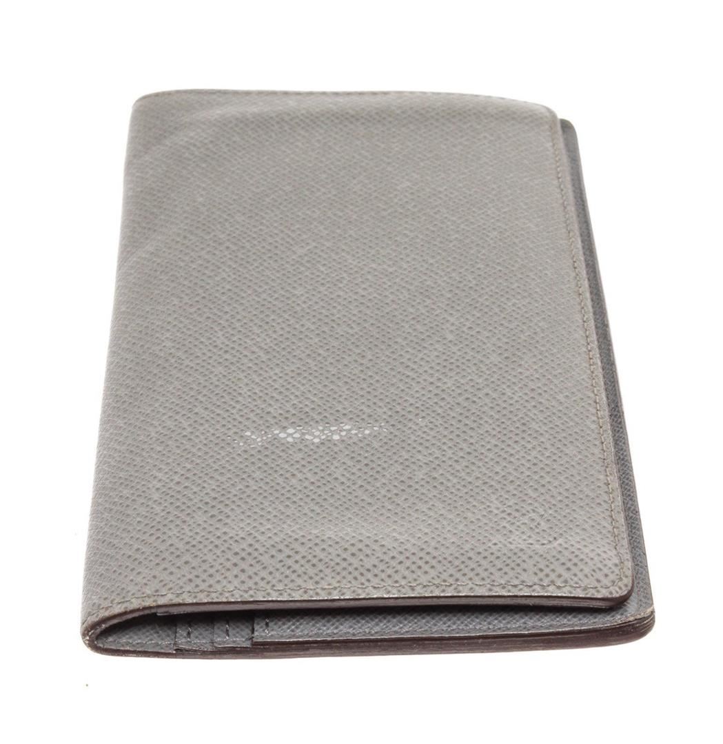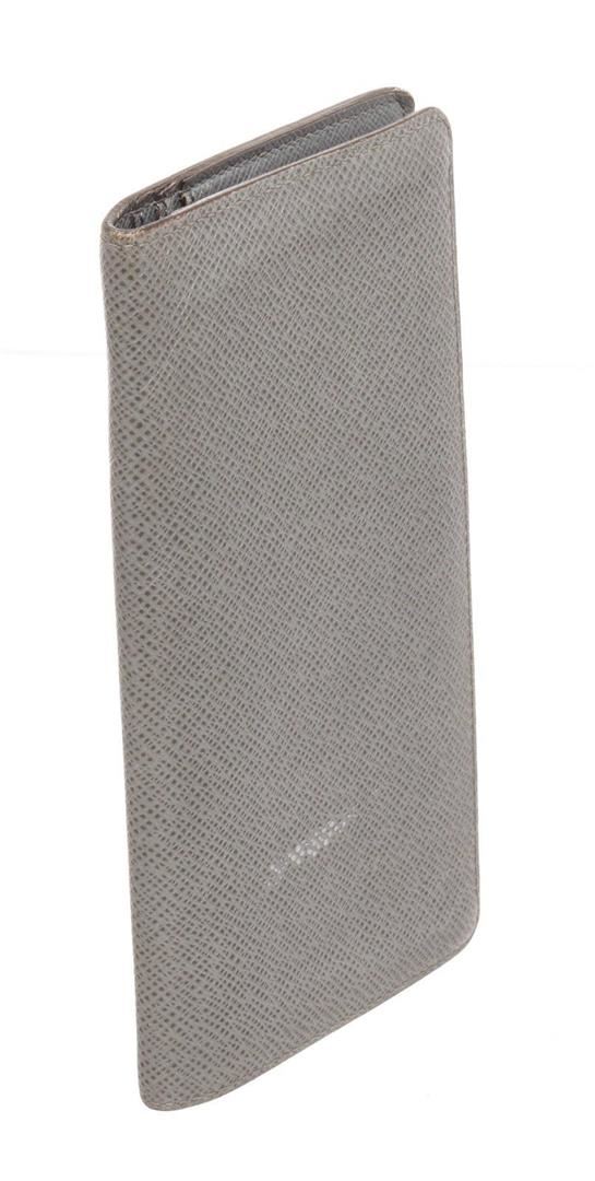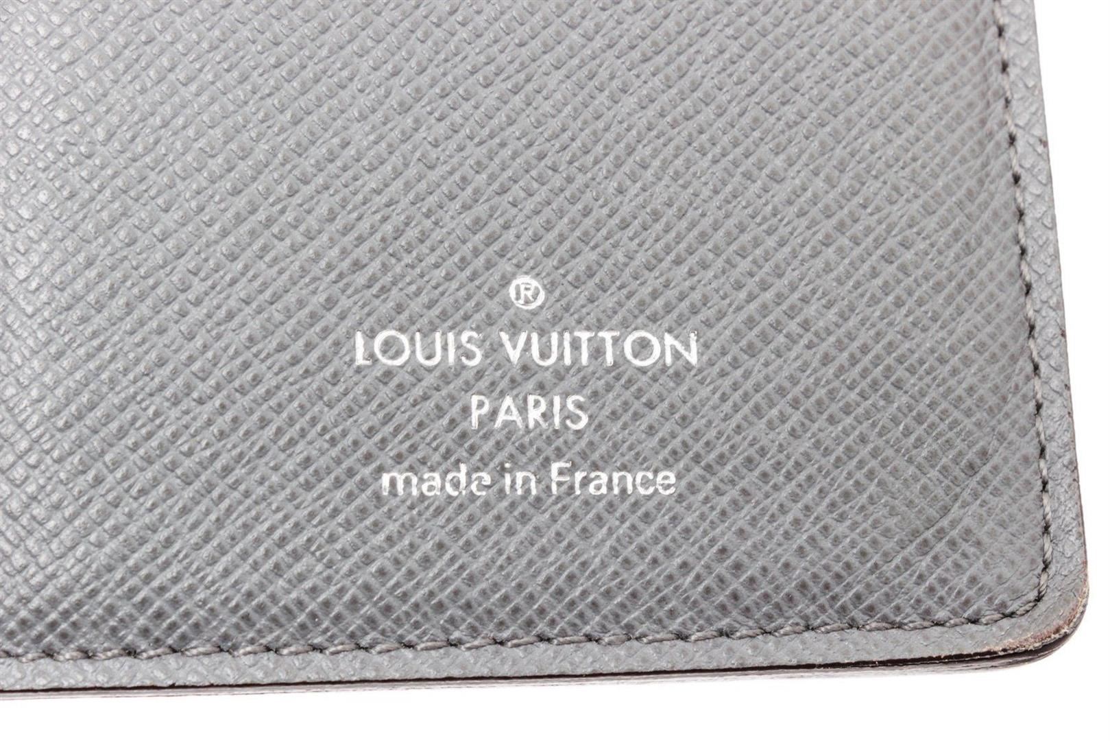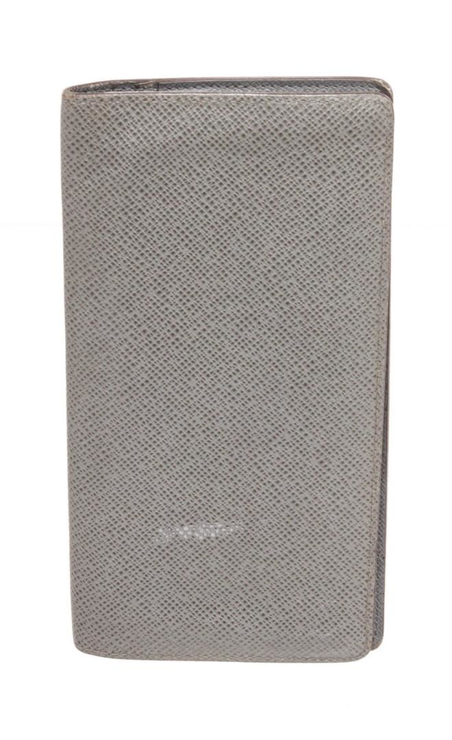 Louis Vuitton Grey Taiga Leather Brazza Wallet with silver-tone hardware, tonal stitching, embossed logo accent at front wall, tonal leather lining, five bill slots, single zip compartment, card slots and bifold closure.