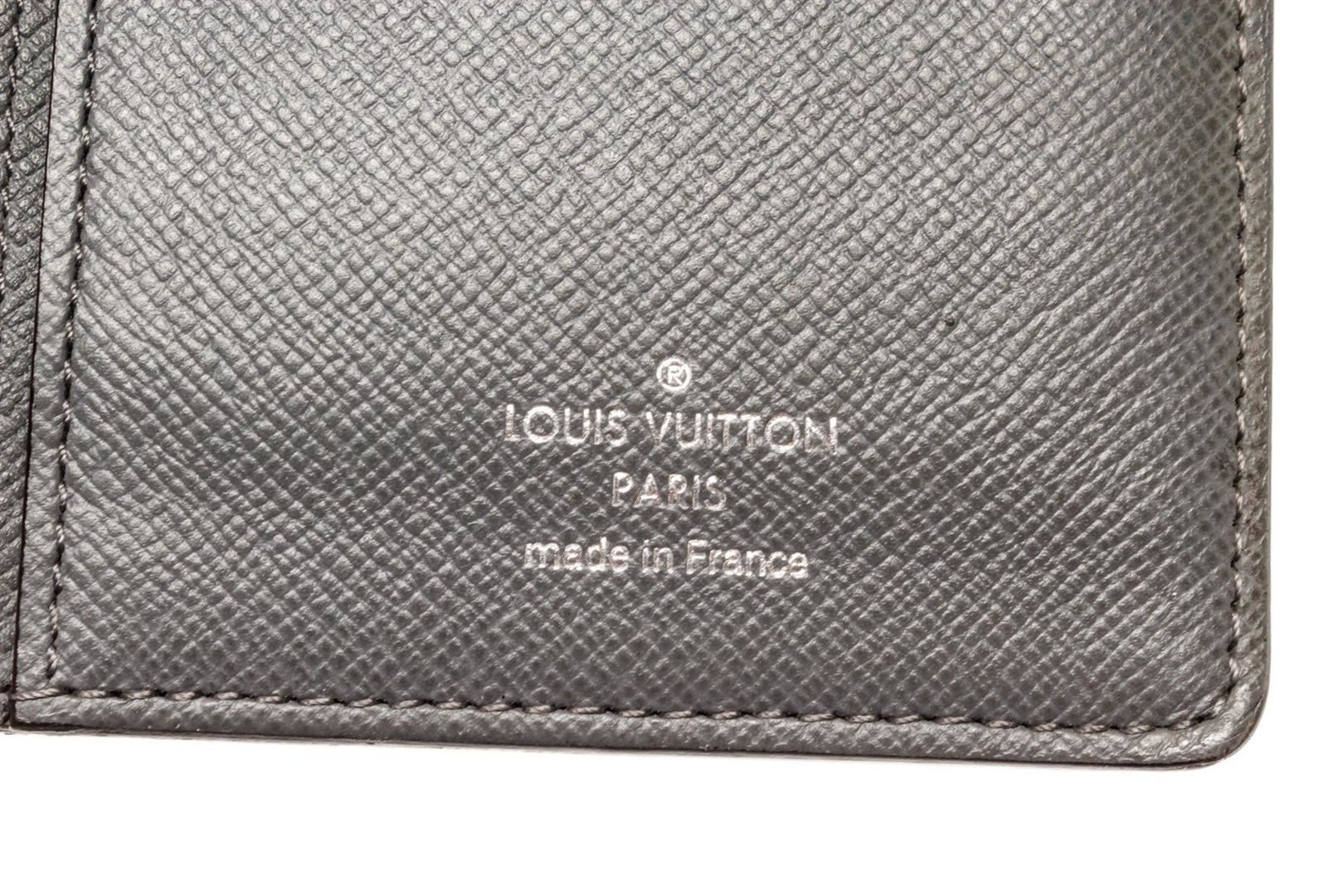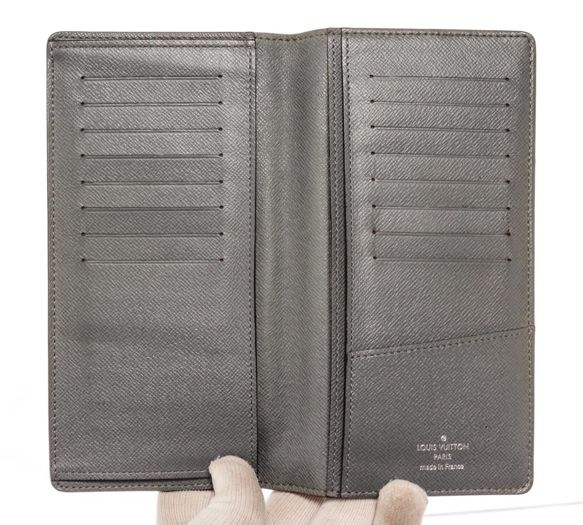 Louis Vuitton Grey Taiga Leather Brazza Wallet with leather, gold-tone hardware, trim tan vachetta leather, interior card holder pocket, leather lining and flap closure.