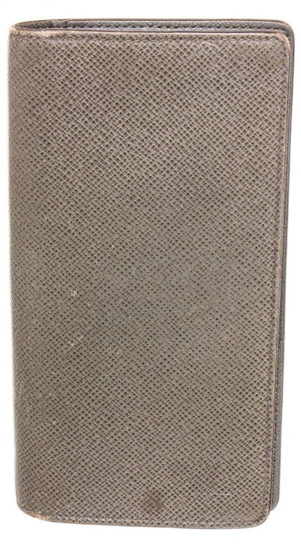 Louis Vuitton grey Taiga Leather long bifold card wallet with embossed logo at front, grey leather interior lining, sixteen card slots, four bill compartments and overall bifold closure. Measurements: Length: 4 in / 10 cm Width: 0.5 in / 1 cm 7.49 in / 19 cmCONDITION: Pre-Owned Good overall, please see photographs for detail.