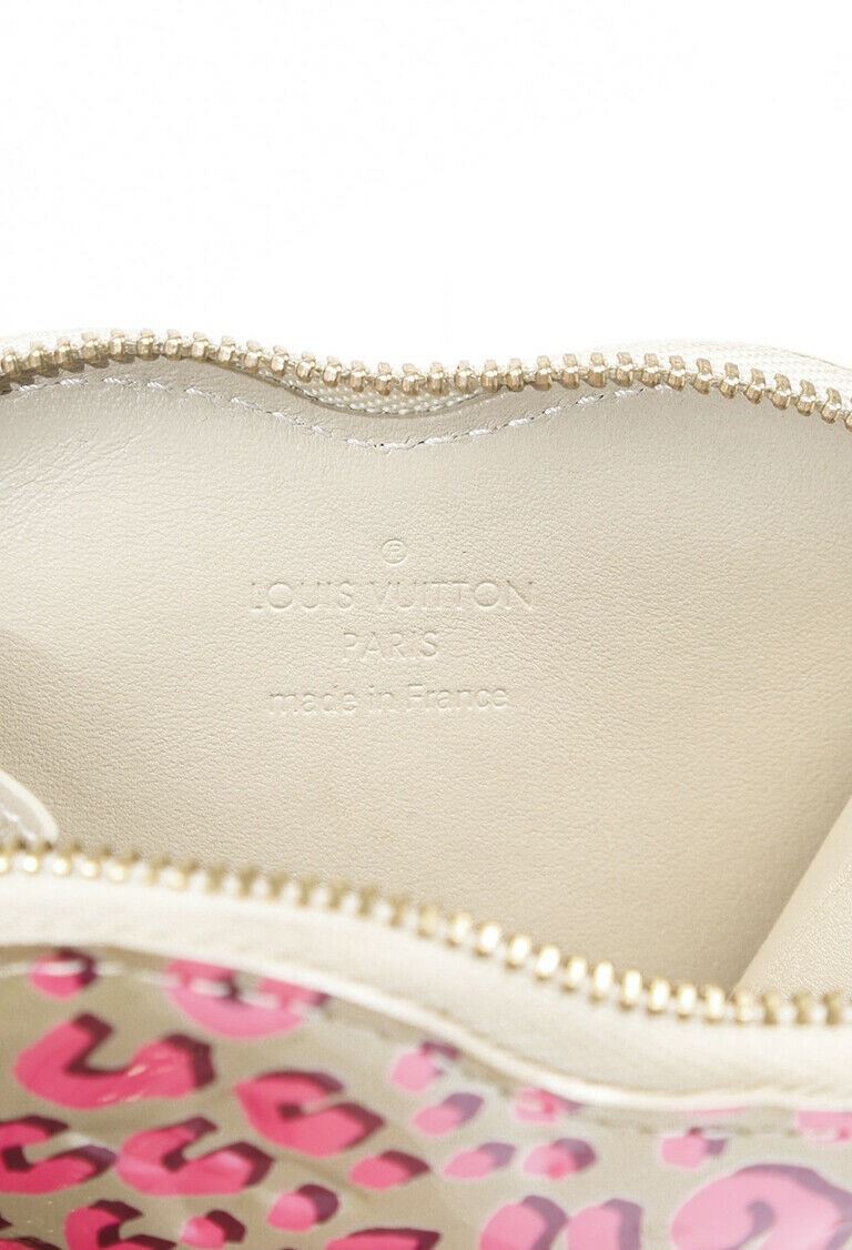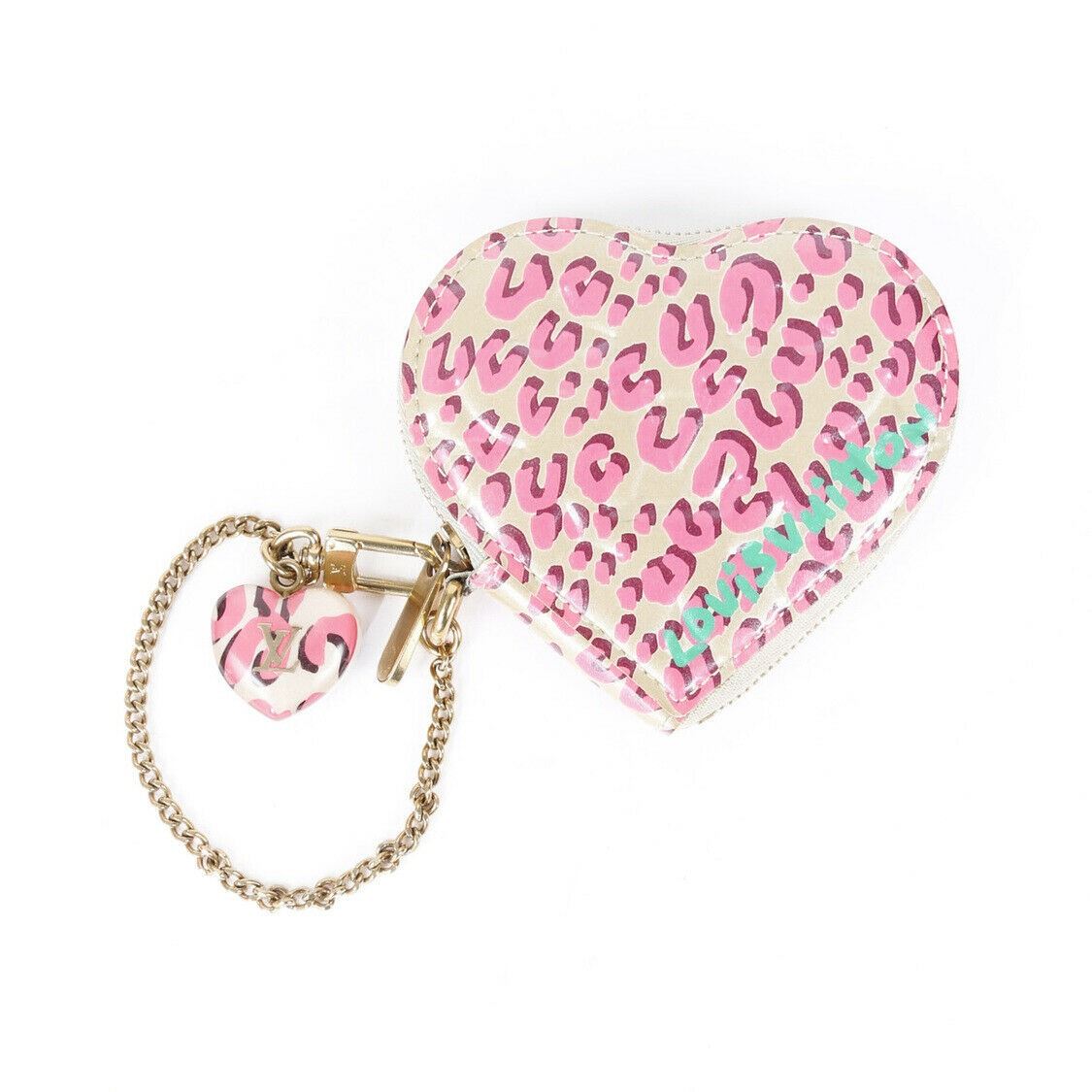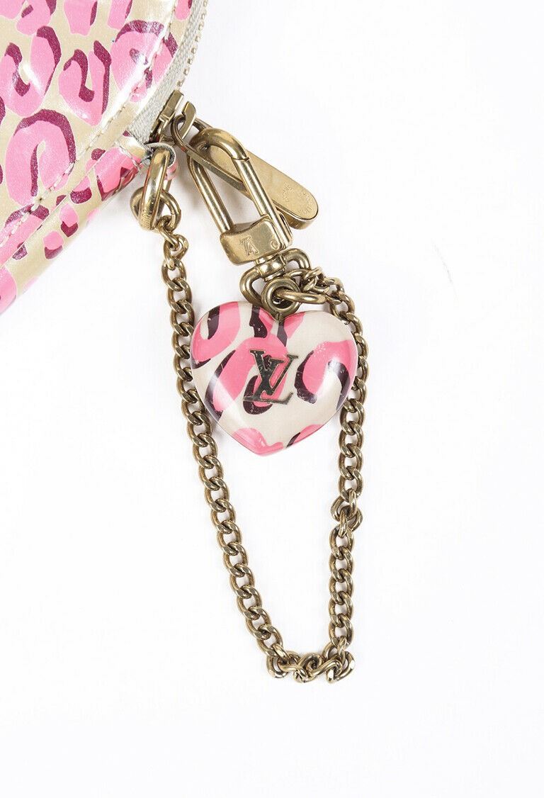 Stephen Sprouse collaboration circa 2010. Louis Vuitton Heart Coin Purse is crafted from animal print Vernis leather and features brass hardware, chainlink clip, zip closure, and a leather interior.