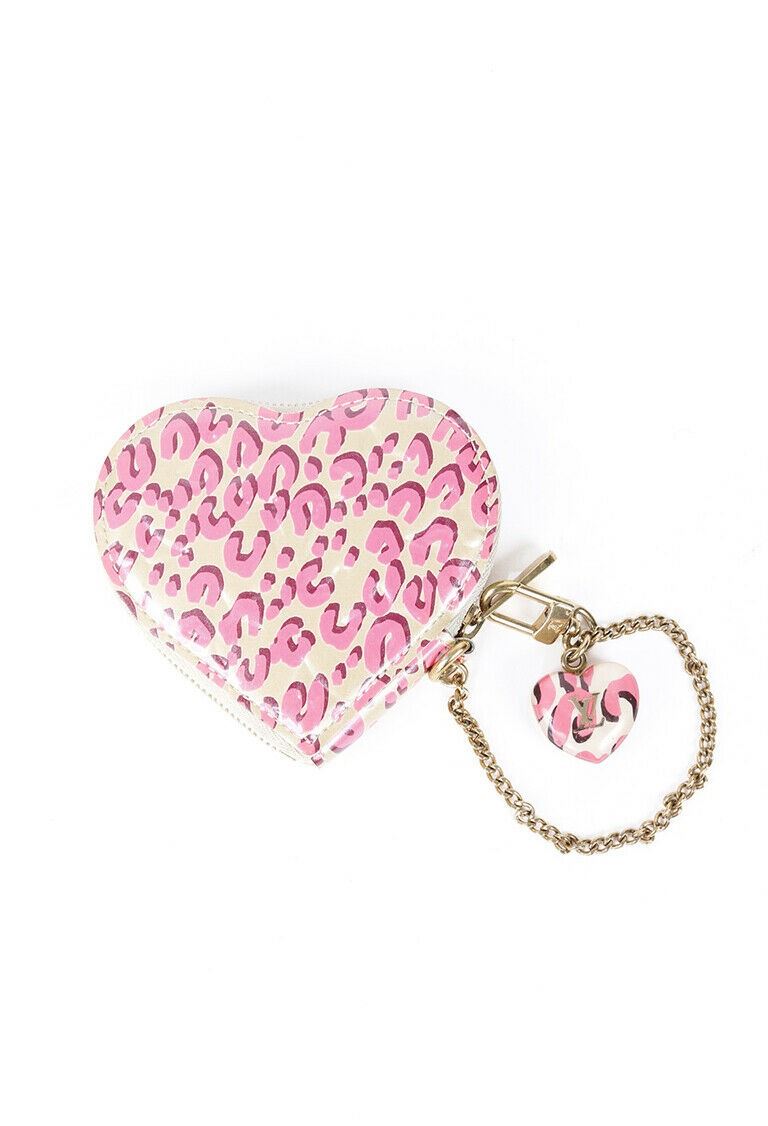 Stephen Sprouse collaboration circa 2010. Louis Vuitton Heart Coin Purse is crafted from animal print Vernis leather and features brass hardware, chainlink clip, zip closure, and a leather interior.