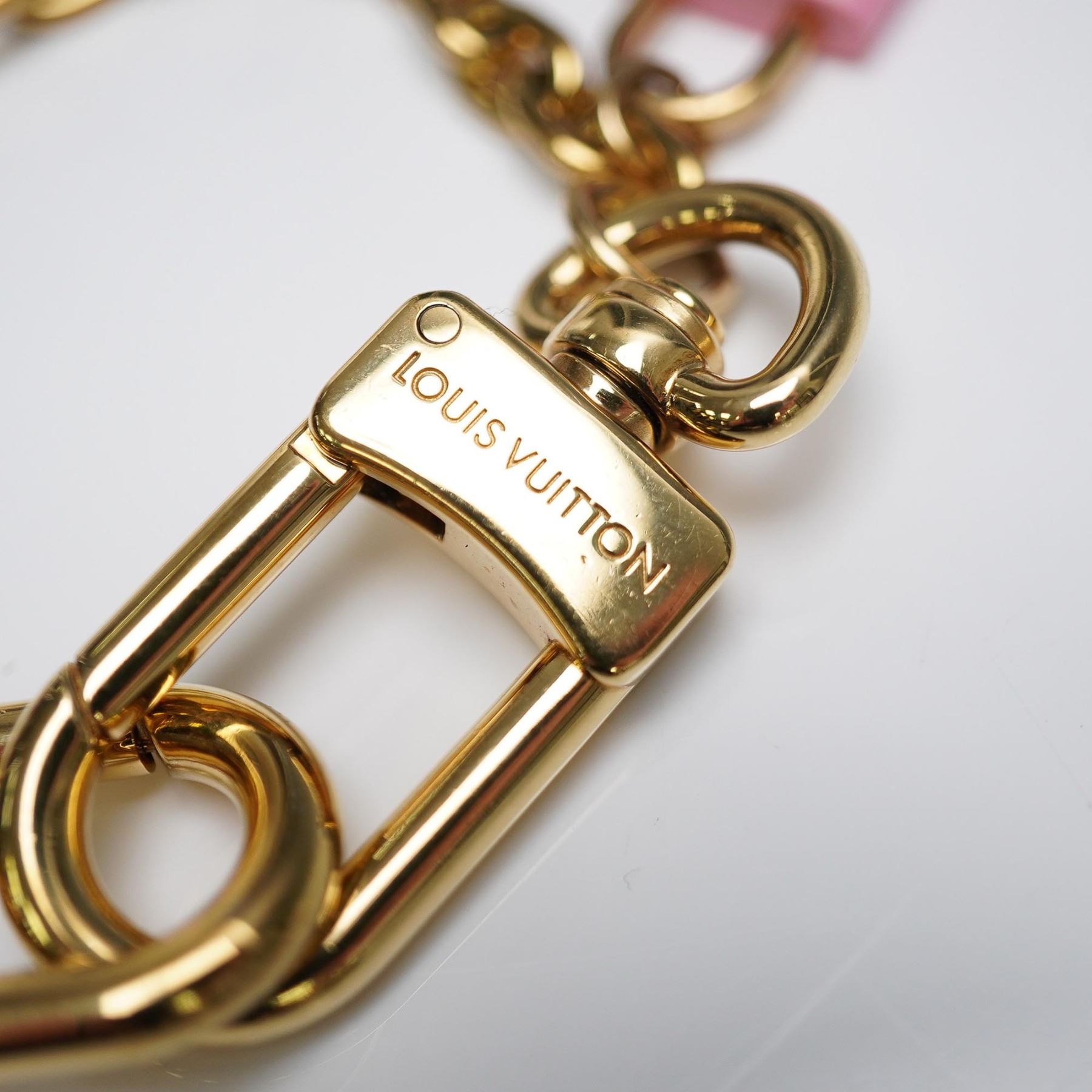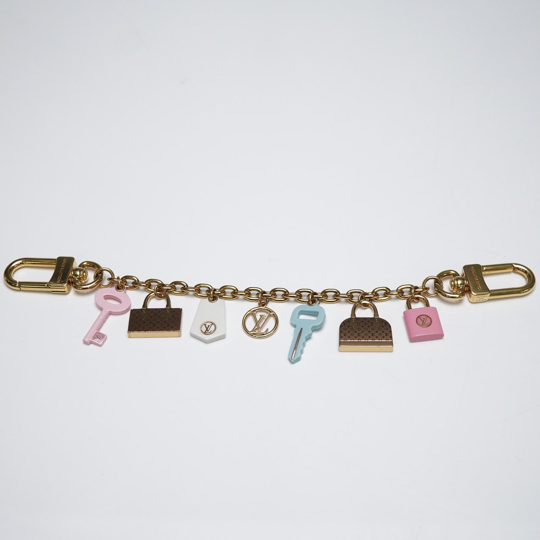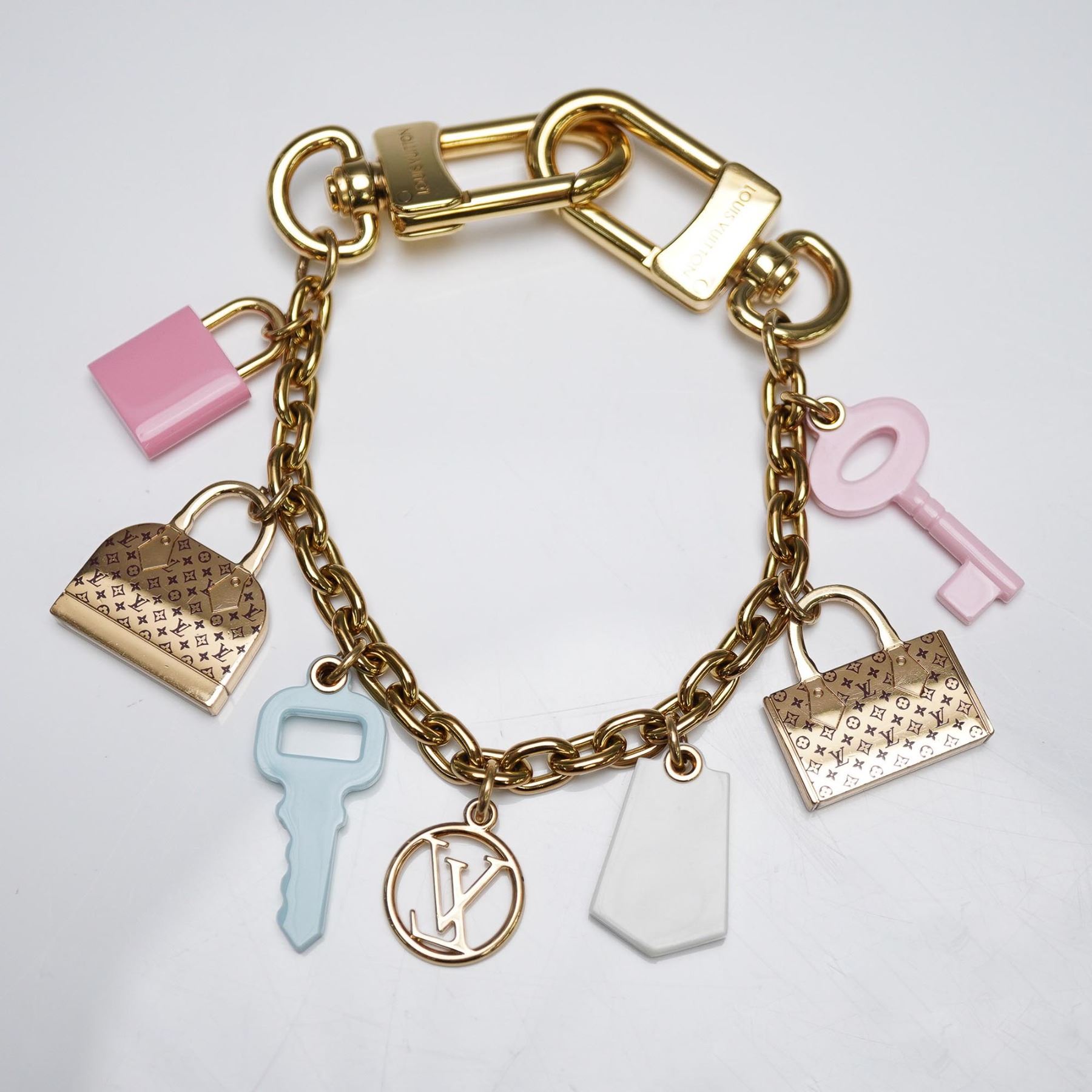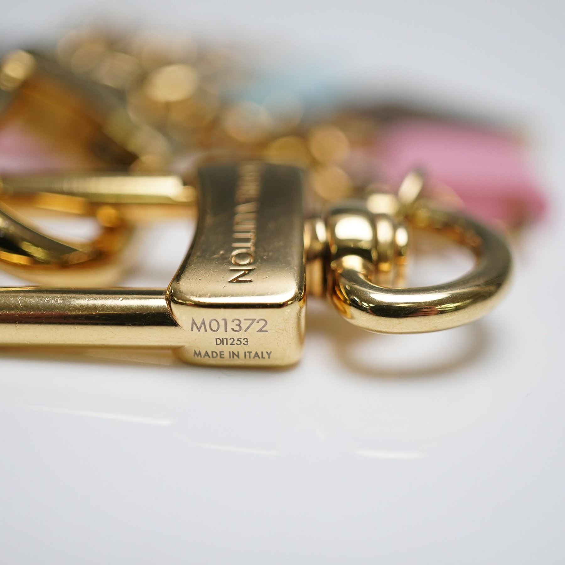 Louis Vuitton Iconic Chain Bag Charm Keychain crafted from enamel and metal with a gold-tone finish. The design features seven attached charms associated with Louis Vuitton themes: a pink key, a blue key, two gold-tone Louis Vuitton bag charms, a pink lock, a white Louis Vuitton tag, and a gold-tone LV monogram. The charms are linked by a chain attached to a snap hook and a circular key ring, both engraved with the Louis Vuitton name. Designed for use as either a decorative bag charm or a functional key holder, this piece highlights multiple elements iconic to the brand. M01372.