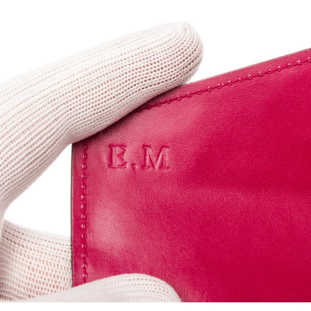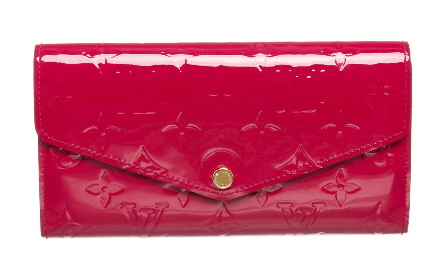 Indian rose pink Vernis leather Louis Vuitton Sarah wallet with brass hardware, dual slip pockets at flap underside, tonal leather lining, dual interior pockets; one with zip closure, six card slots at interior wall and snap closure at front flap.