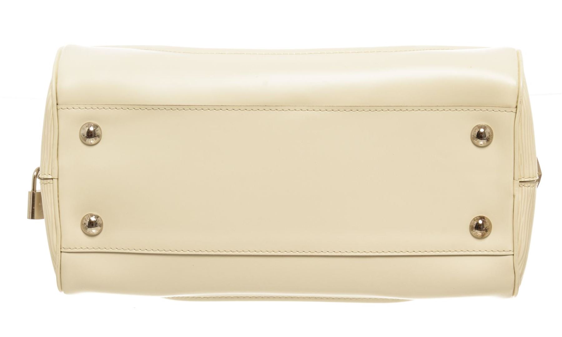 One Louis Vuitton Ivory Epi Leather Bowling Montaigne PM Bag. Item is sold AS-IS. All available information is listed in the description and shown in the photo. Ivory Epi leather Louis Vuitton Bowling Montaigne PM with silver-tone hardware, LV padlock, dual rolled leather top handles, light beige canvas lining, dual pockets at interior walls and zip closure at top. .