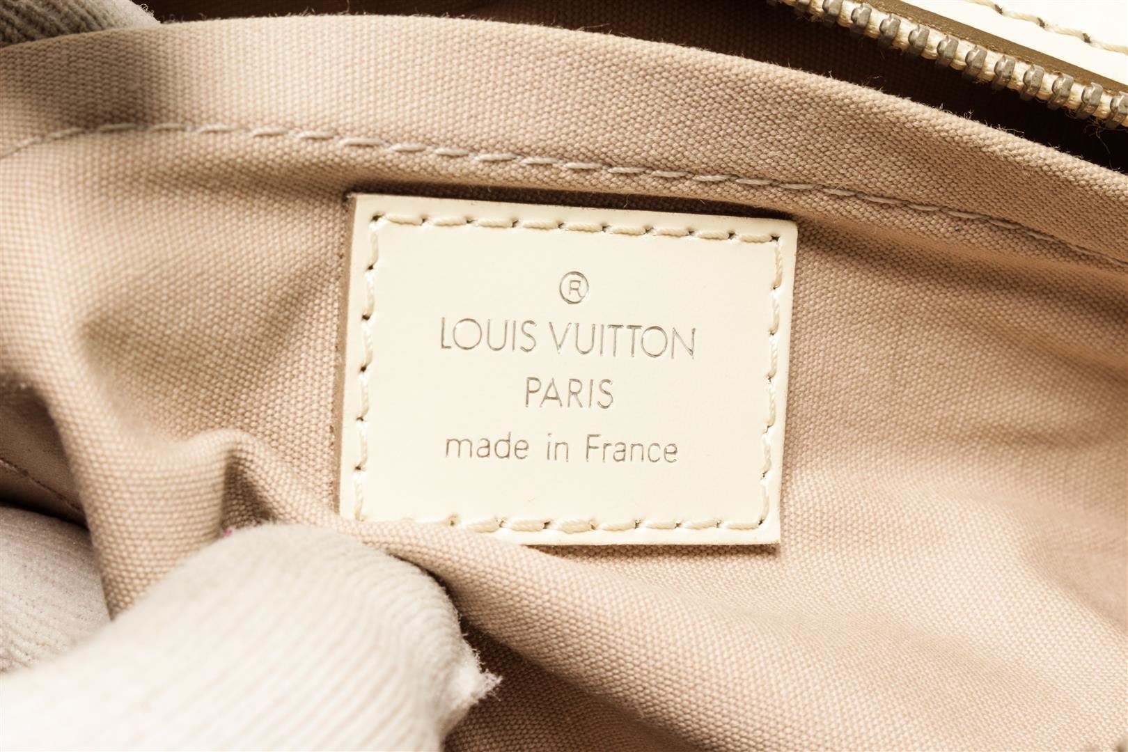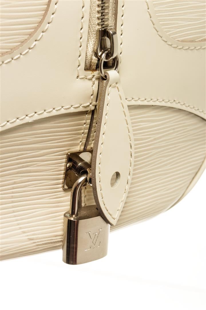 One Louis Vuitton Ivory Epi Leather Bowling Montaigne PM Bag. Item is sold AS-IS. All available information is listed in the description and shown in the photo. Ivory Epi leather Louis Vuitton Bowling Montaigne PM with silver-tone hardware, LV padlock, dual rolled leather top handles, light beige canvas lining, dual pockets at interior walls and zip closure at top. .