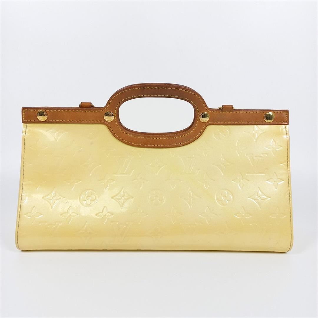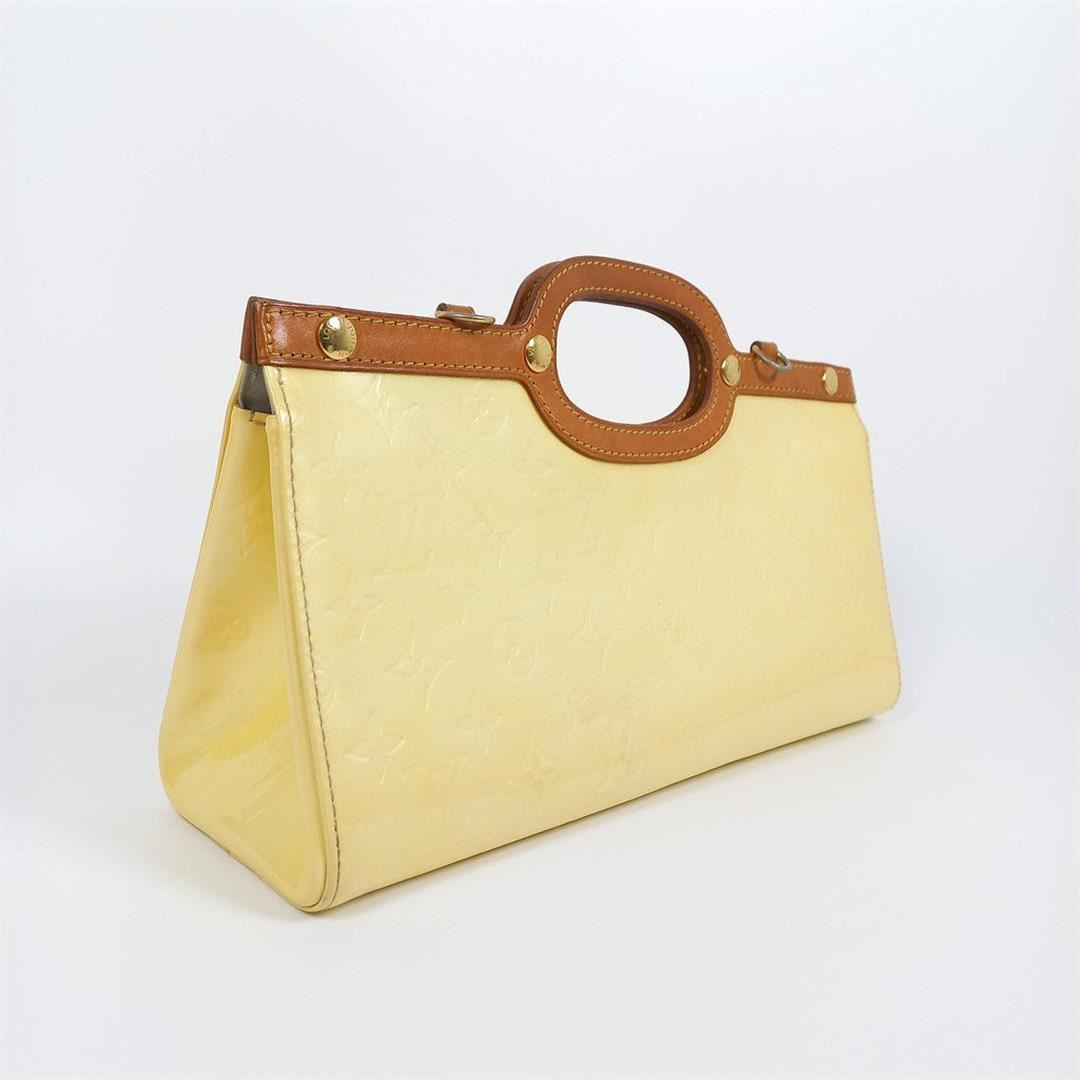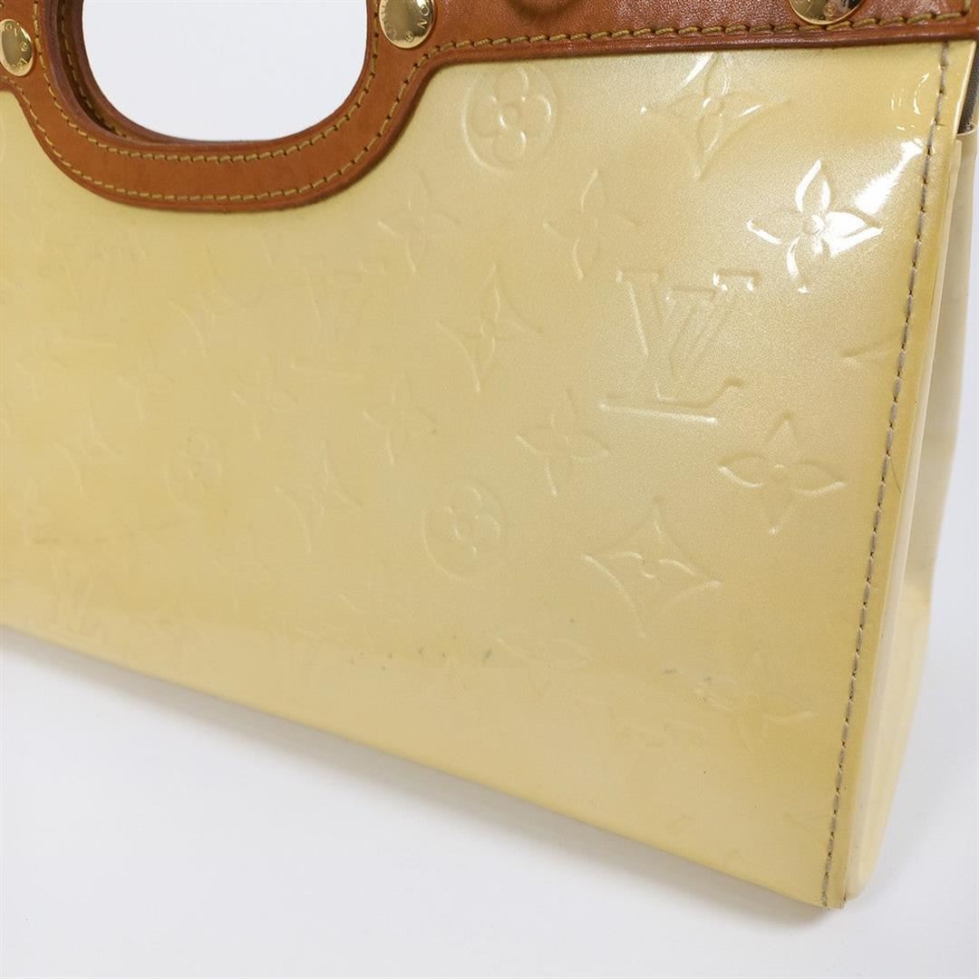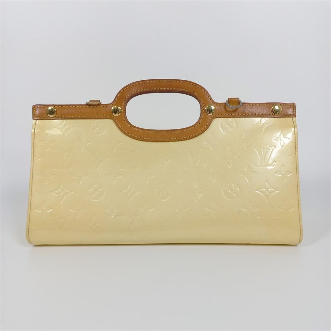 Ivory Monogram Vernis leather Louis Vuitton Roxbury Drive bag with gold-tone hardware, tan vachetta leather trim featuring yellow contrast stitching, dual cutout handles, a detachable brown leather shoulder strap, snap expansions at sides, neutral canvas