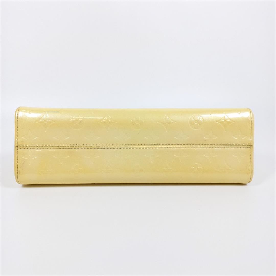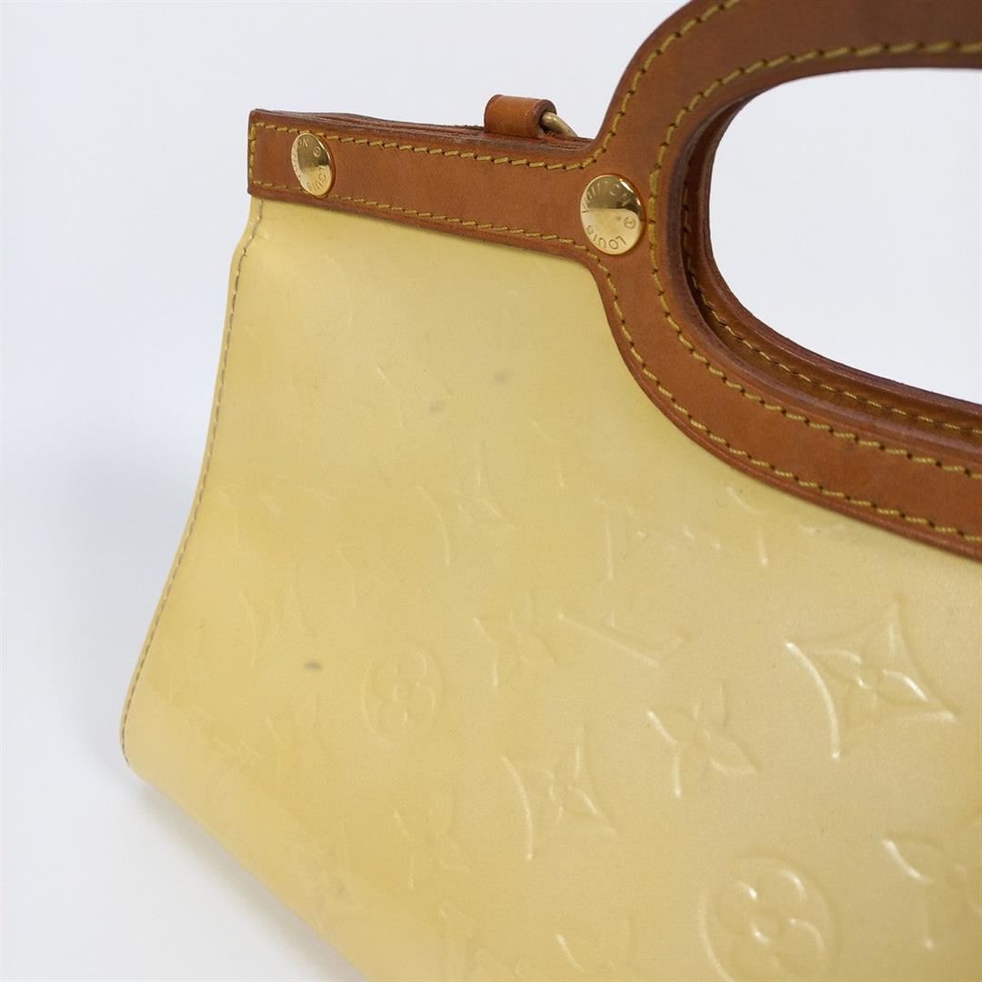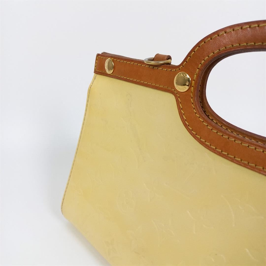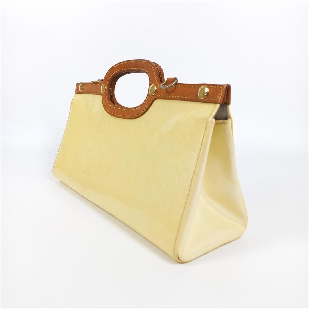 Ivory Monogram Vernis leather Louis Vuitton Roxbury Drive bag with gold-tone hardware, tan vachetta leather trim featuring yellow contrast stitching, dual cutout handles, a detachable brown leather shoulder strap, snap expansions at sides, neutral canvas