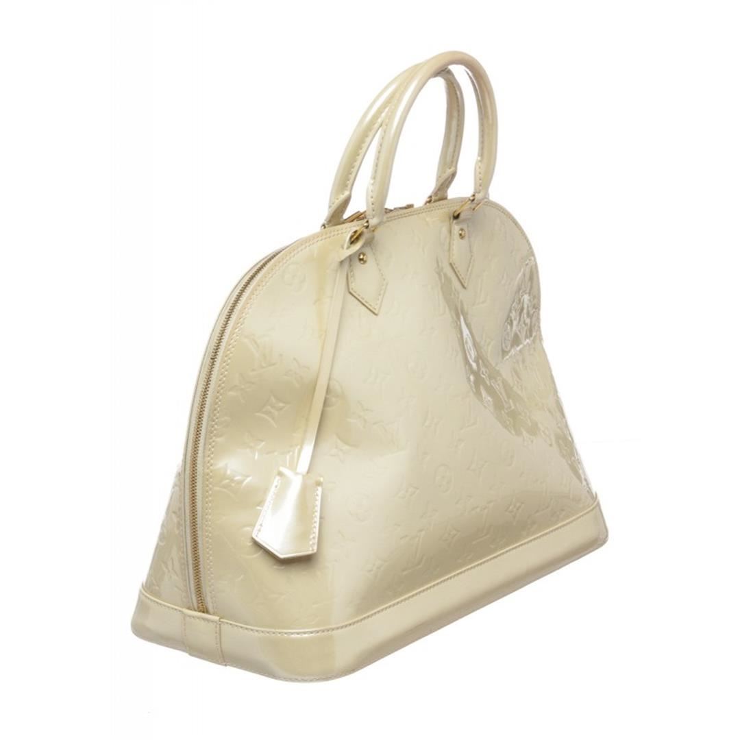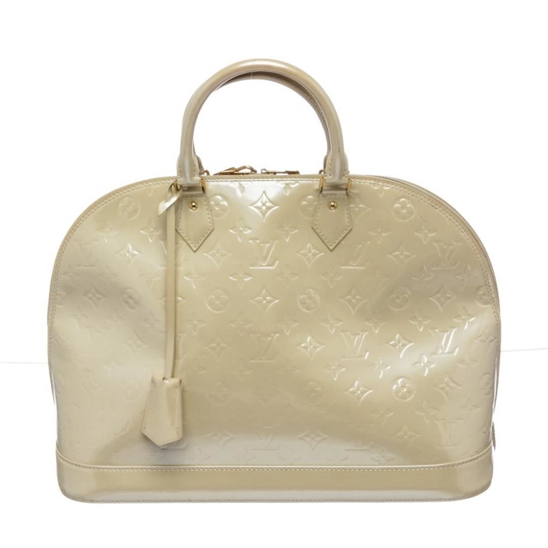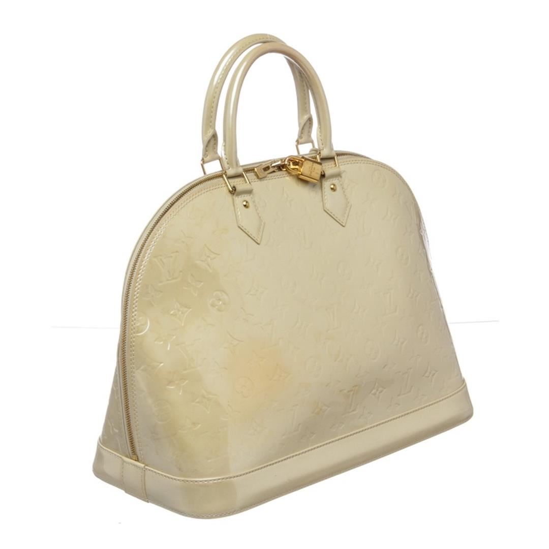 Ivory Louis Vuitton Vernis patent leather handle bag with brass hardware, rolled handles, key and lock at exterior, canvas lining, two interior wall pockets and zip closure at top.