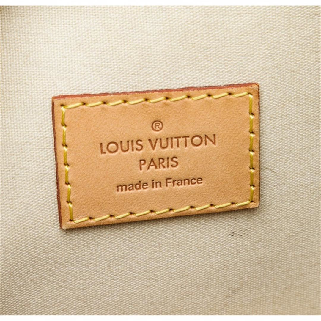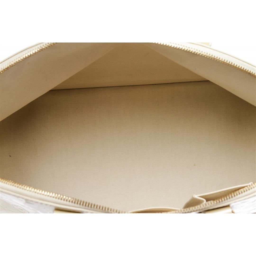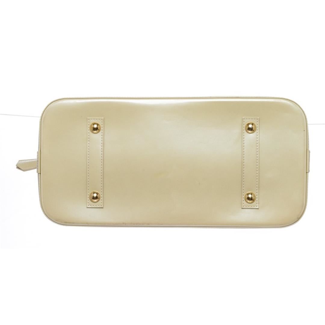Ivory Louis Vuitton Vernis patent leather handle bag with brass hardware, rolled handles, key and lock at exterior, canvas lining, two interior wall pockets and zip closure at top.