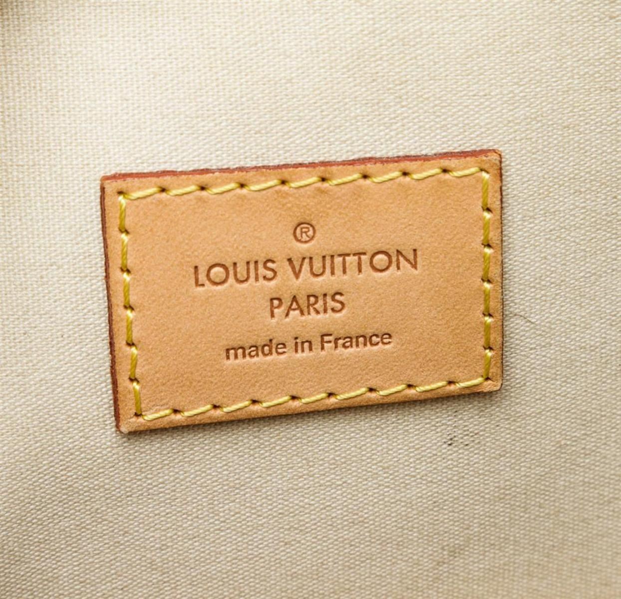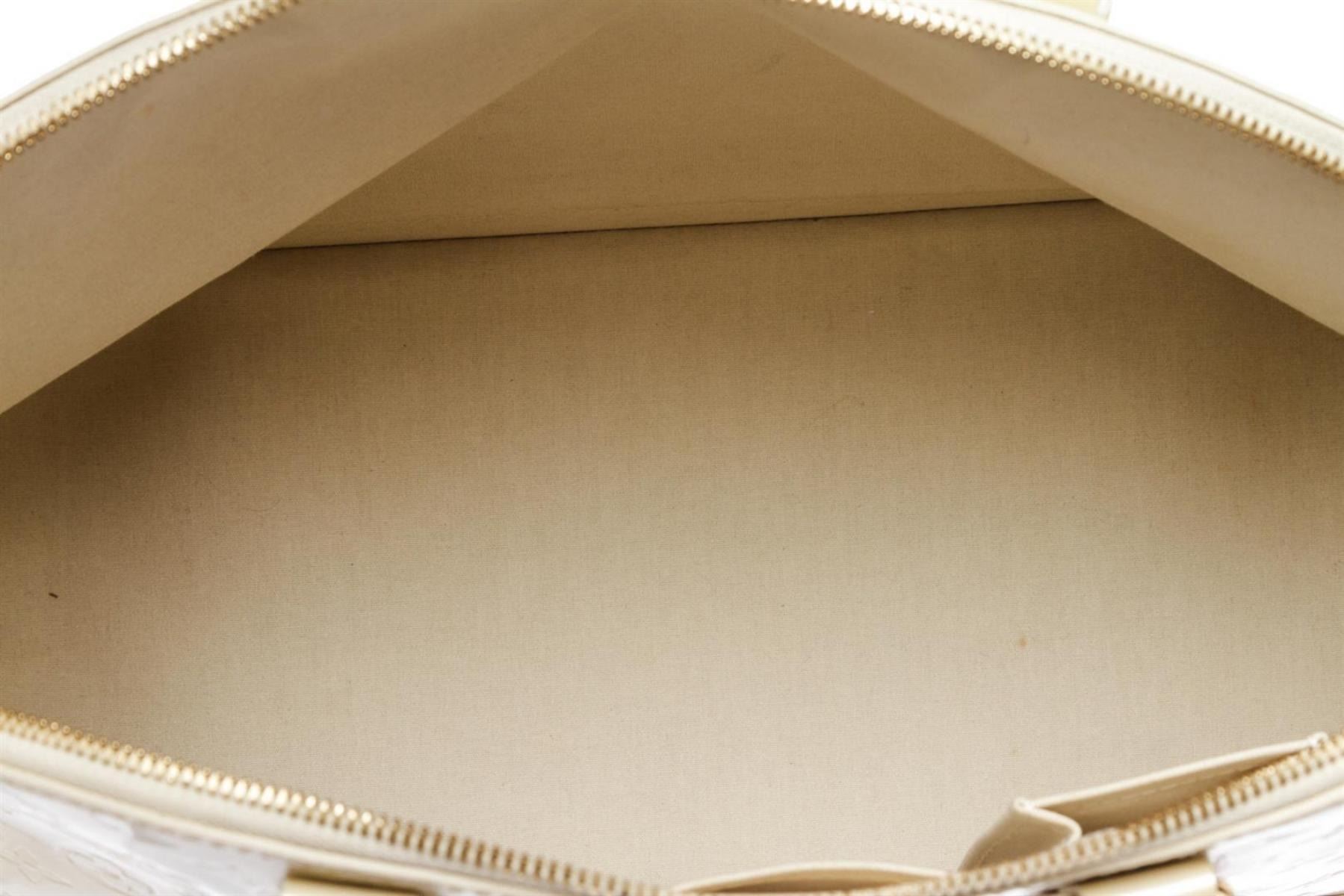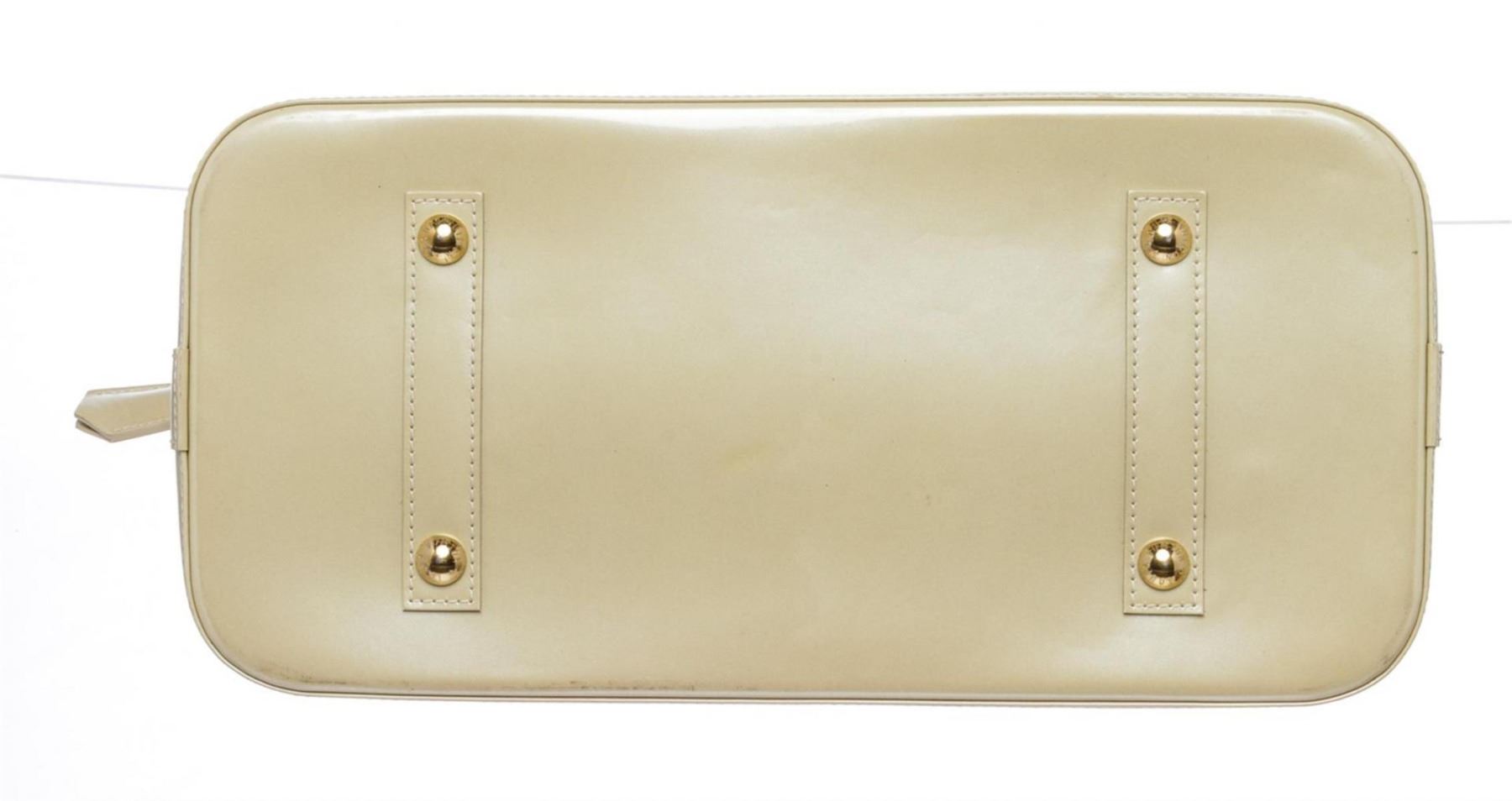 One Louis Vuitton Ivory Vernis Monogram Alma GM Handbag. Ivory Louis Vuitton Vernis patent leather handle bag with brass hardware, rolled handles, key and lock at exterior, canvas lining, two interior wall pockets and zip closure at top. Please note: Discoloration on one side.