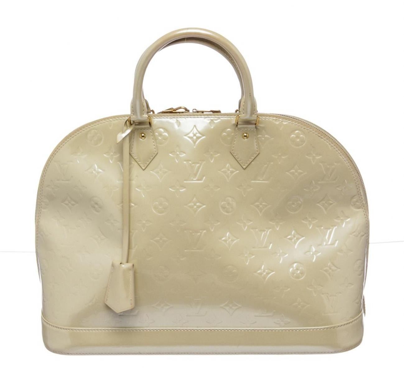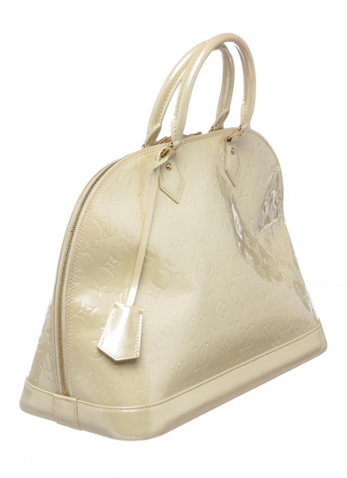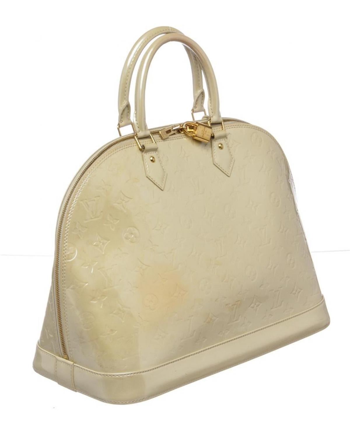 One Louis Vuitton Ivory Vernis Monogram Alma GM Handbag. Ivory Louis Vuitton Vernis patent leather handle bag with brass hardware, rolled handles, key and lock at exterior, canvas lining, two interior wall pockets and zip closure at top. Please note: Discoloration on one side.
