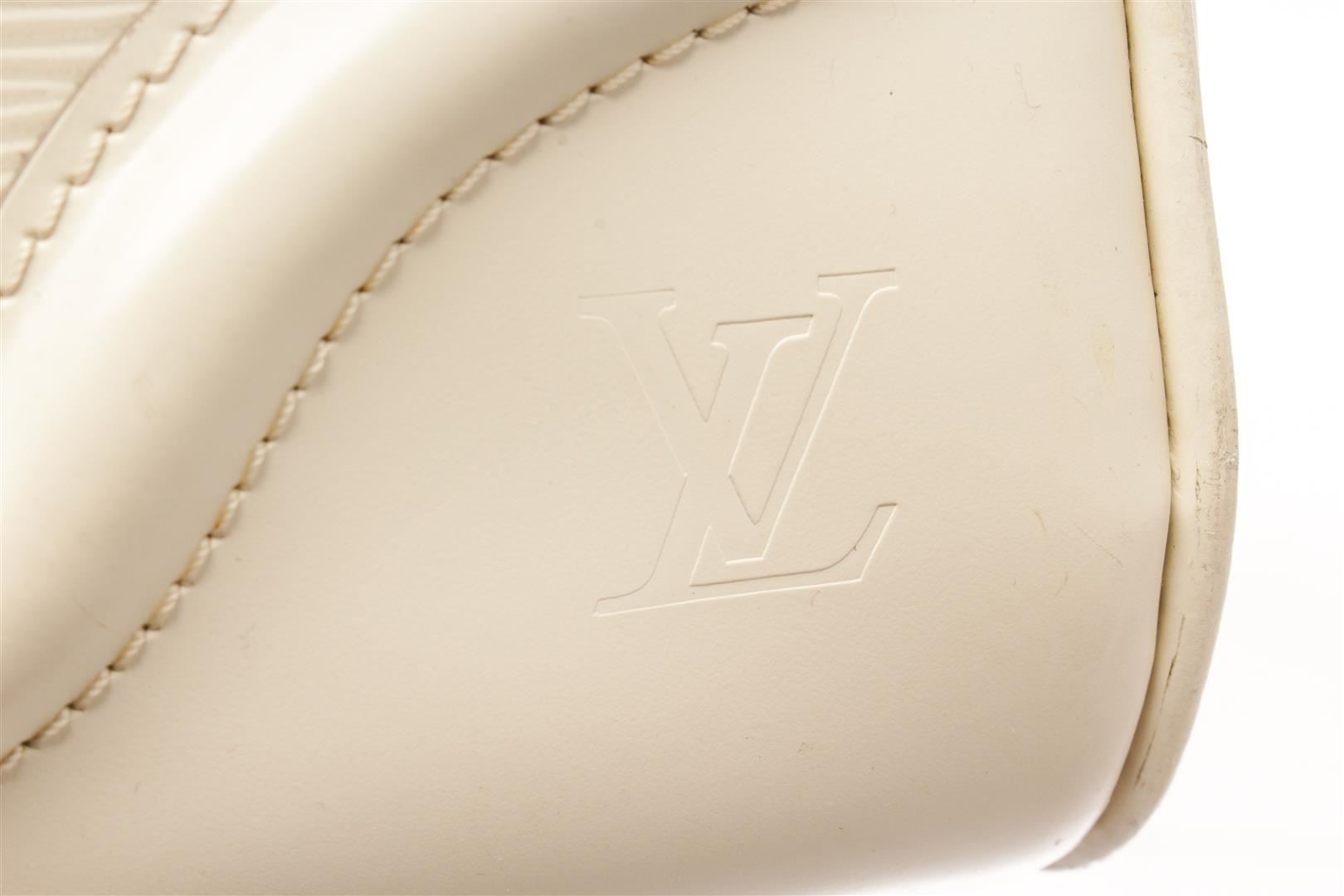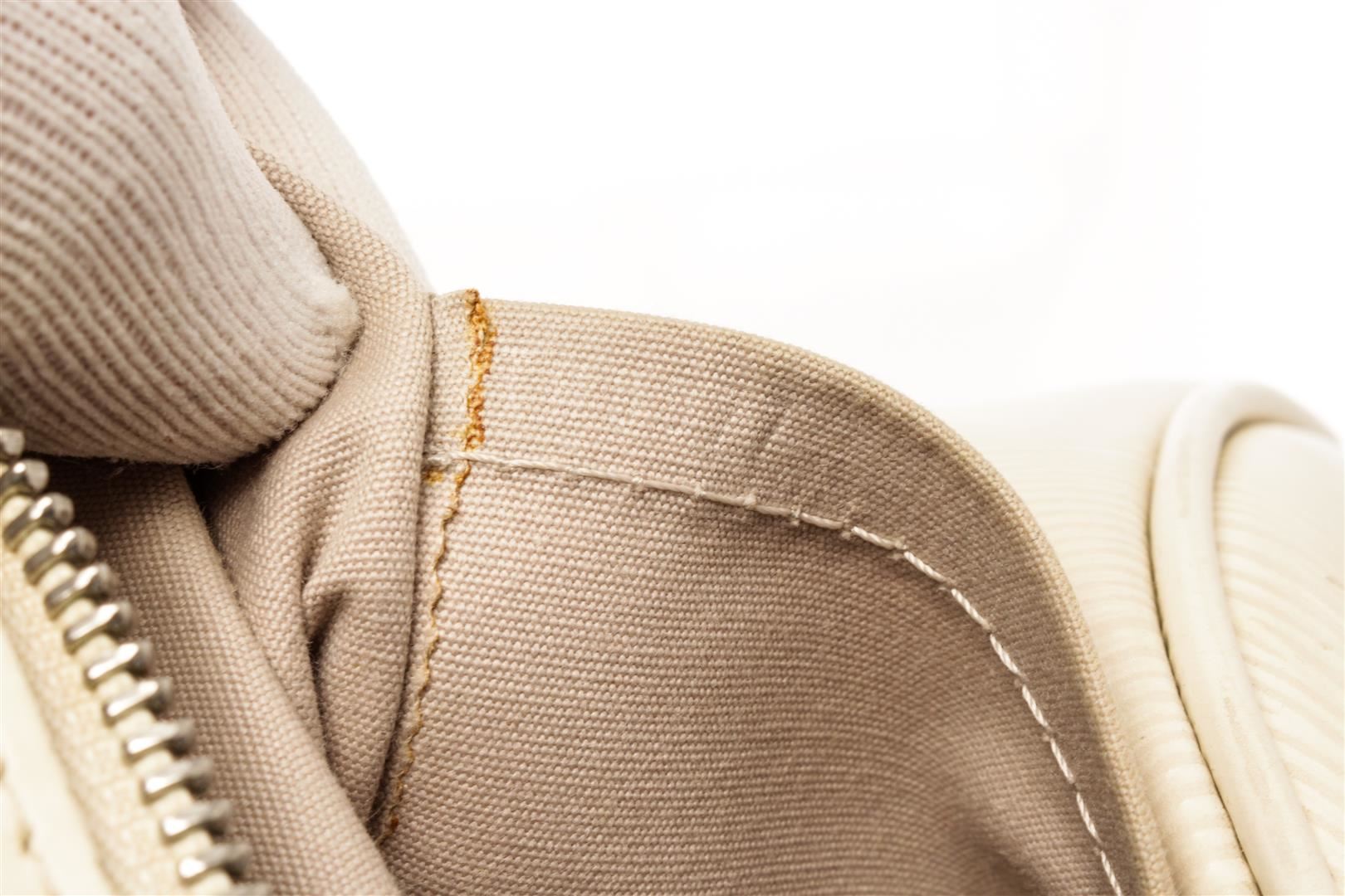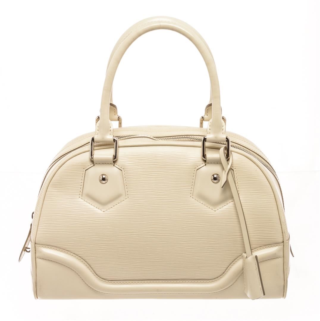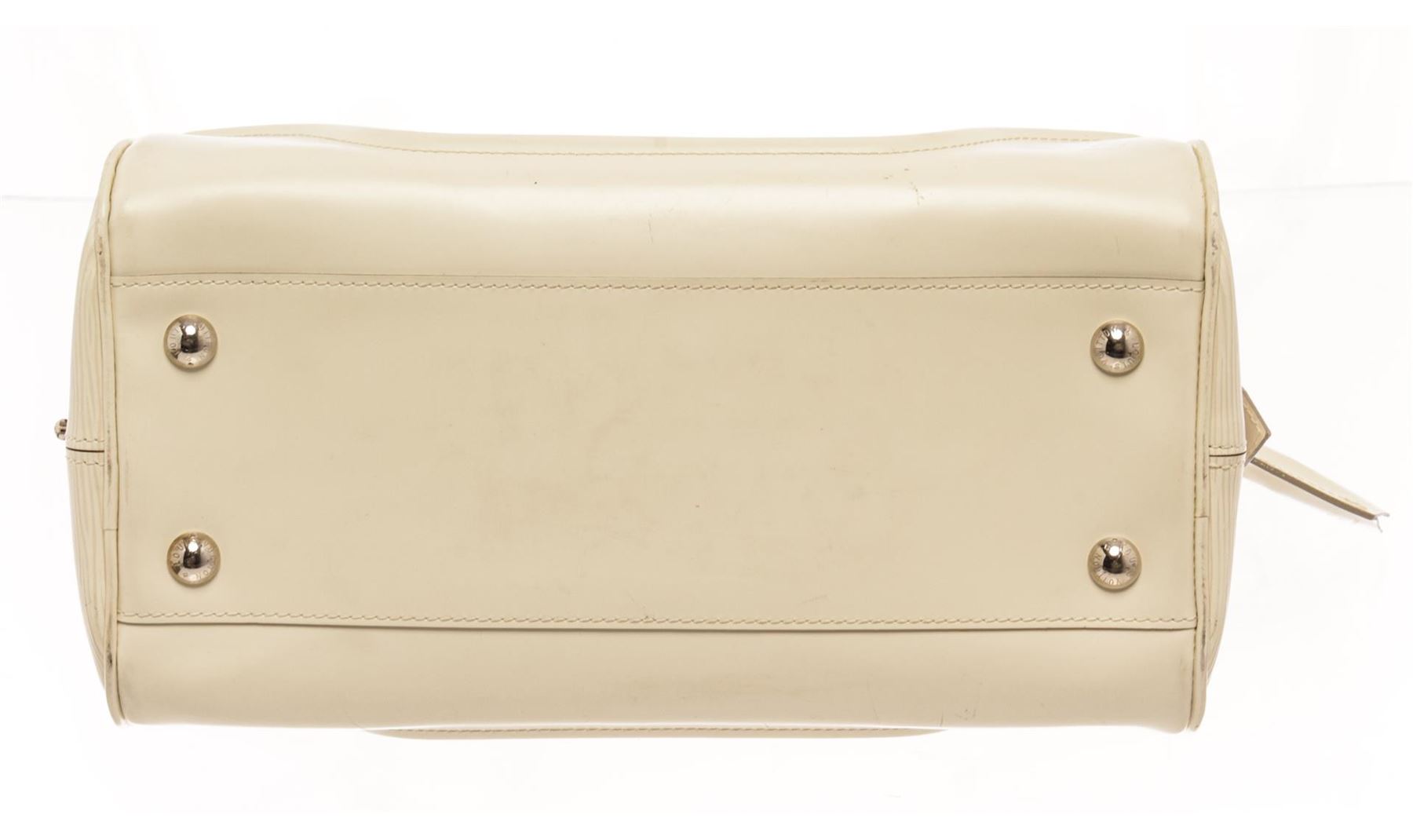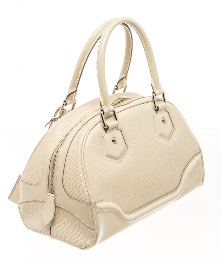 Louis Vuitton Ivory White Epi Leather Bowling Montaigne BB Tote Bag. All available information is listed in the description and shown in the photos. Louis Vuitton Ivory White Epi Leather Bowling Montaigne BB Tote Bag with signature epi texture, silver-tone hardware, leather key fob, metal feet, top zip fastening, two rounded top handles, internal slip pocket, internal logo patch, full lining. Condition Details: Some surface scuffing and wear on bottom and corners. Depth 7.1 in, Height 9.1 in, Width 13 in, Handle 6 in / Depth 18.034 cm, Height 23.114 cm, Width 33.02 cm, Handle 15.24 cm