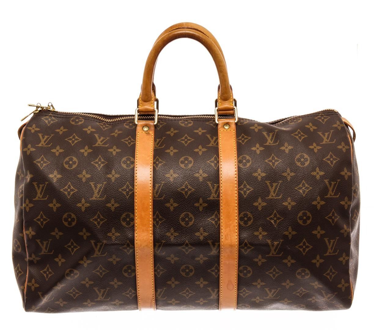 Louis Vuitton Keepall 45 Duffle Bag Brown Monogram Coated Canvas. Brand: Louis Vuitton, Style: Keepall 45, Type: Duffle Bag, Exterior Color: Brown Monogram, Exterior Material: Coated Canvas, Exterior Pockets: None, Interior Color: Brown, Interior Material: Suede, Interior Pockets: One, Closure: Zip, Handle/Strap Type: Top Handle, Length: 8, Width: 18, Height: 11, Handle Drop: 4. Condition: Vachetta has watermarks. Item is sold AS-IS and all information pertaining to this lot is available in the photos or this description.