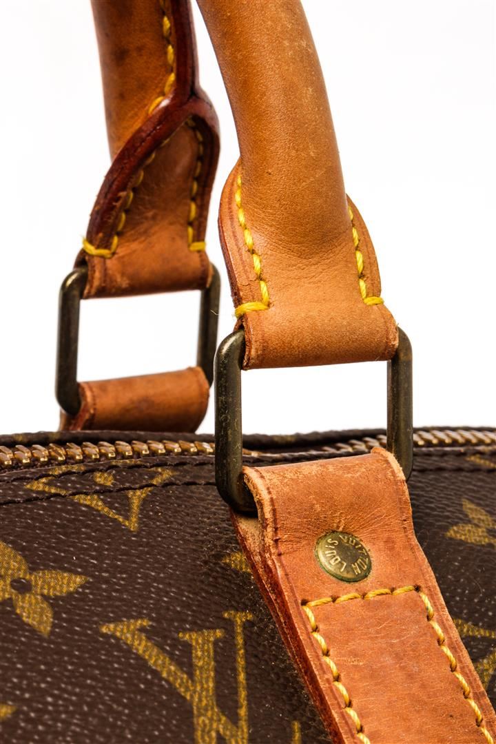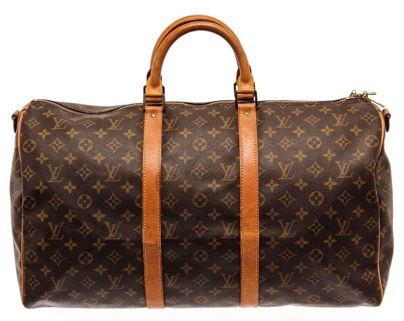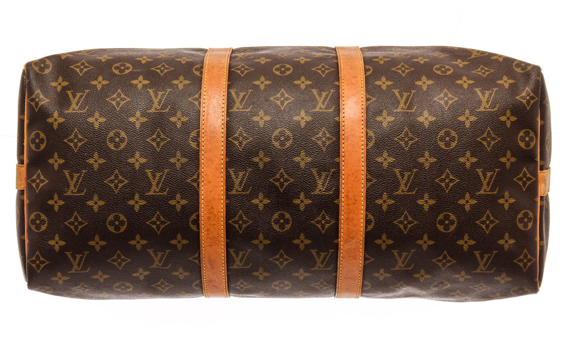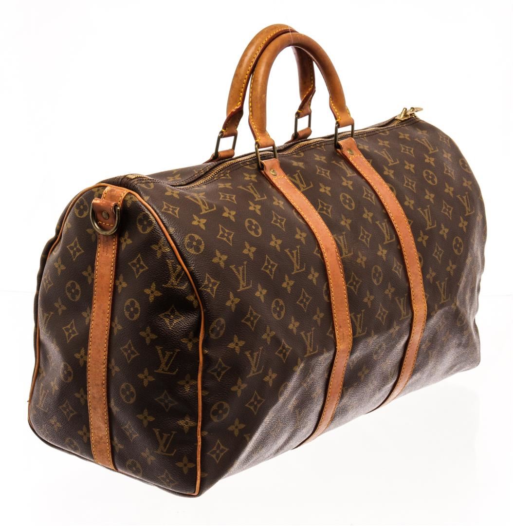 Louis Vuitton Keepall 50 Bandouliere Boston Bag Brown Monogram Coated Canvas. Brand: Louis Vuitton, Style: Keepall 50 Bandouliere, Type: Boston Bag, Exterior Color: Brown Monogram, Exterior Material: Coated Canvas, Exterior Pockets: None, Interior Color: Brown, Interior Material: Canvas, Interior Pockets: One, Closure: Zip, Handle/Strap Type: Top Handle, Length: 19.7, Width: 8.7, Height: 11.4, Handle Drop: 4, Strap Drop: 16-2N/A. Condition: Vachetta has watermarks and creasing. Item is sold AS-IS and all information pertaining to this lot is available in the photos or this description.