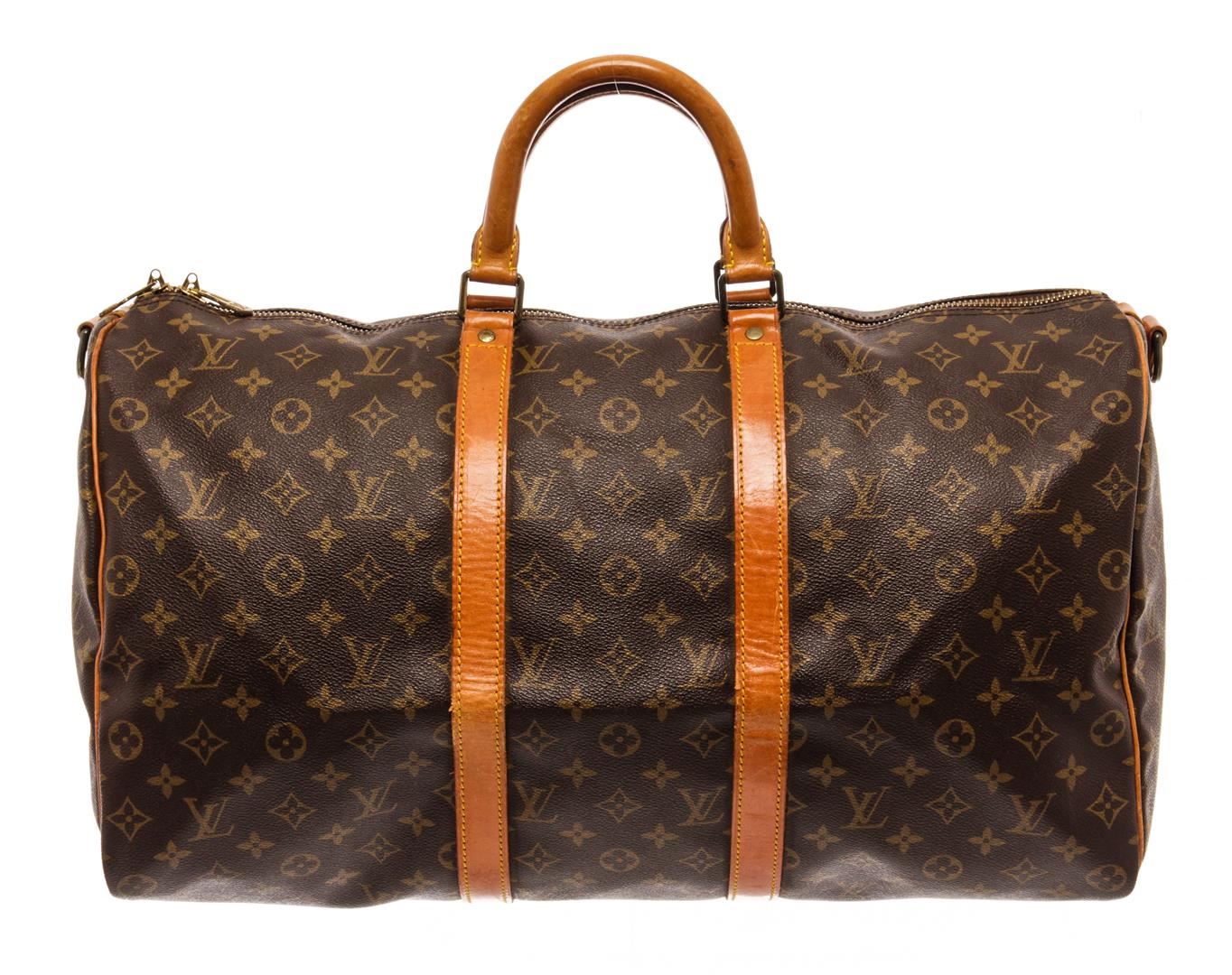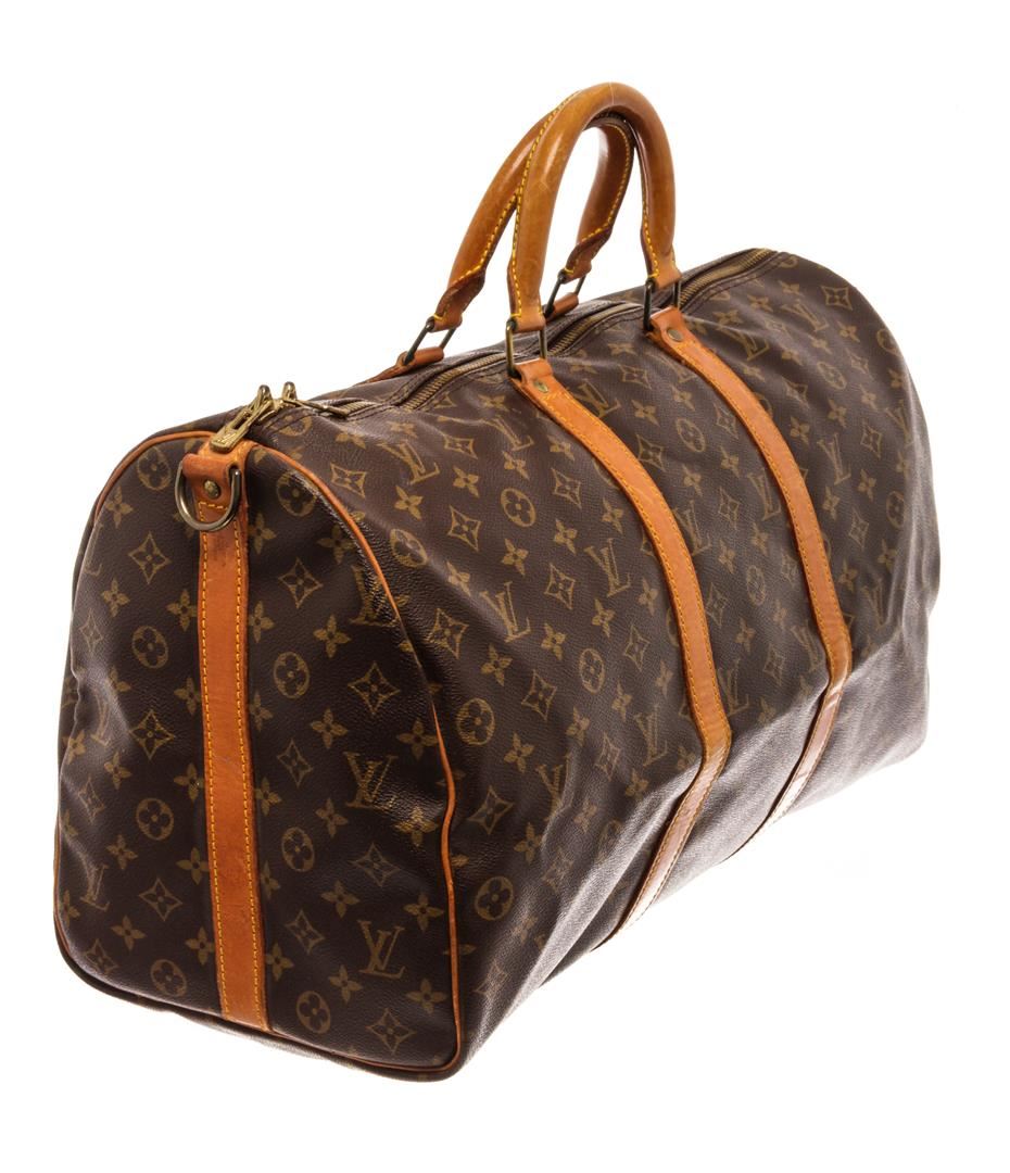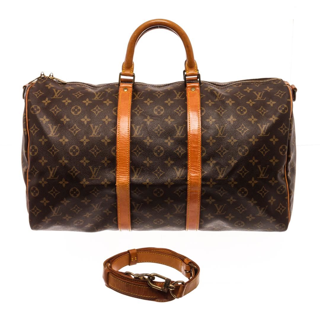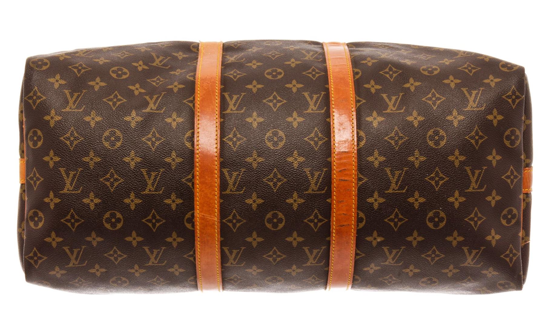 Louis Vuitton Keepall 50 Bandouliere Duffle Bag Brown Monogram Coated Canvas. Brand: Louis Vuitton, Style: Keepall 50 Bandouliere, Type: Duffle Bag, Exterior Color: Brown Monogram, Exterior Material: Coated Canvas, Exterior Pockets: None, Interior Color: Brown, Interior Material: Canvas, Interior Pockets: One, Closure: Zip, Handle/Strap Type: Top Handle/ Adjustable, Length: 19.7, Width: 8.7, Height: 11.4, Handle Drop: 4, Strap Drop: 19. Condition: Vachetta is worn. Item is sold AS-IS and all information pertaining to this lot is available in the photos or this description.