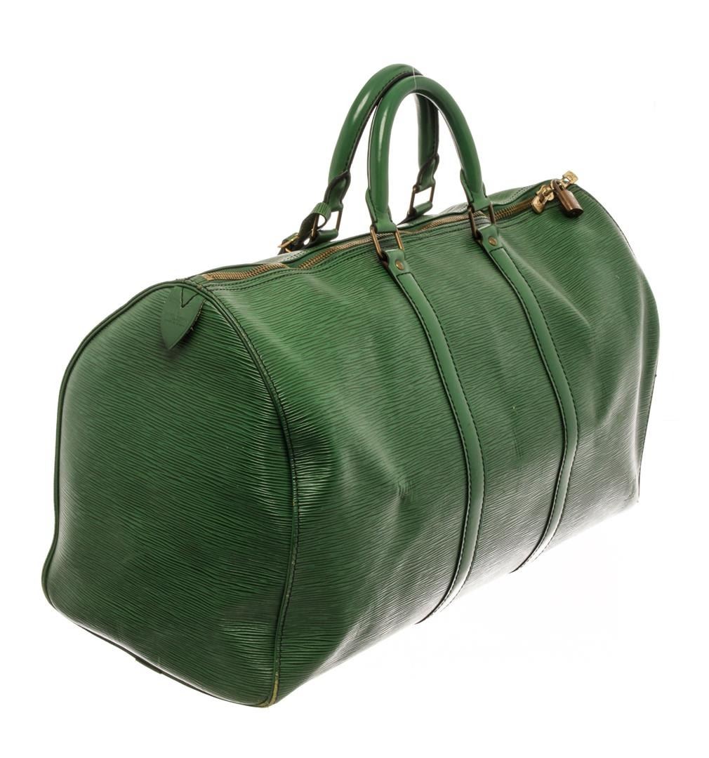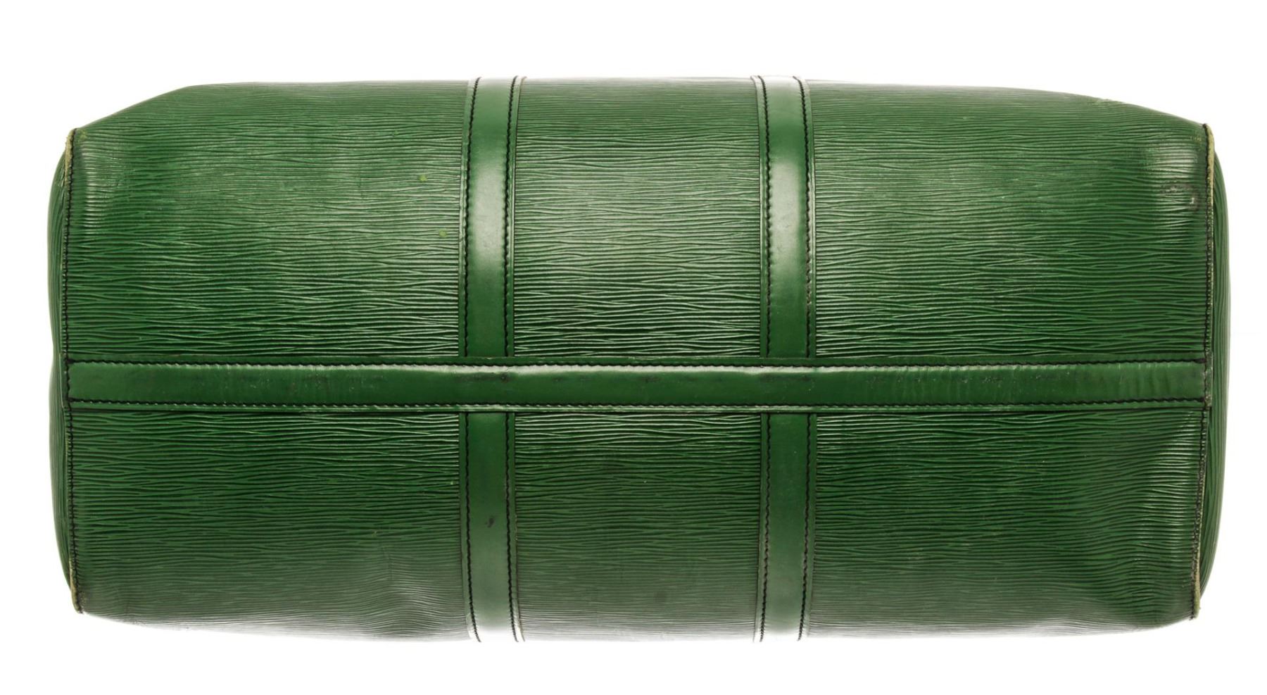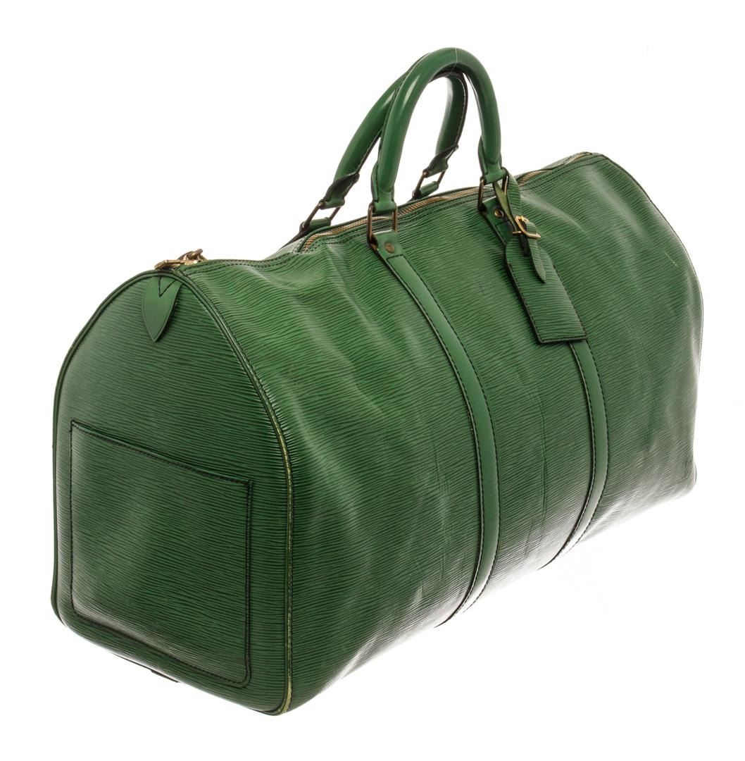 Louis Vuitton Keepall 50 Boston Bag Green Epi Leather. Brand: Louis Vuitton, Style: Keepall 50, Type: Boston Bag, Exterior Color: Green Epi, Exterior Material: Leather, Exterior Pockets: None, Interior Color: Green, Interior Material: Suede, Interior Pockets: One, Closure: Zip, Handle/Strap Type: Top Handle, Length: 19.7, Width: 8.7, Height: 11.4, Handle Drop: 4. Condition: Leather is creased, scratches all around. Item is sold AS-IS and all information pertaining to this lot is available in the photos or this description.