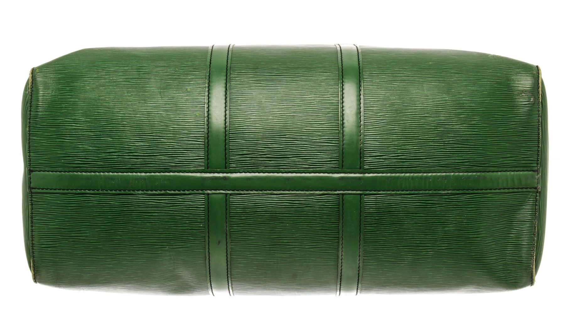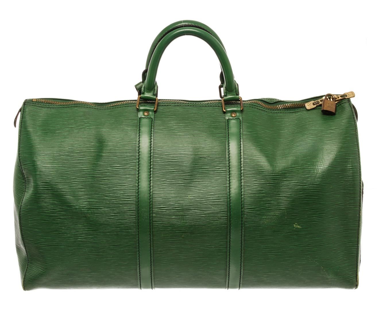 Louis Vuitton Keepall 50 Boston Bag Green Epi Leather. Brand: Louis Vuitton, Style: Keepall 50, Type: Boston Bag, Exterior Color: Green Epi, Exterior Material: Leather, Exterior Pockets: None, Interior Color: Green, Interior Material: Suede, Interior Pockets: One, Closure: Zip, Handle/Strap Type: Top Handle, Length: 19.7, Width: 8.7, Height: 11.4, Handle Drop: 4. Condition: Leather is creased, scratches all around. Item is sold AS-IS and all information pertaining to this lot is available in the photos or this description.