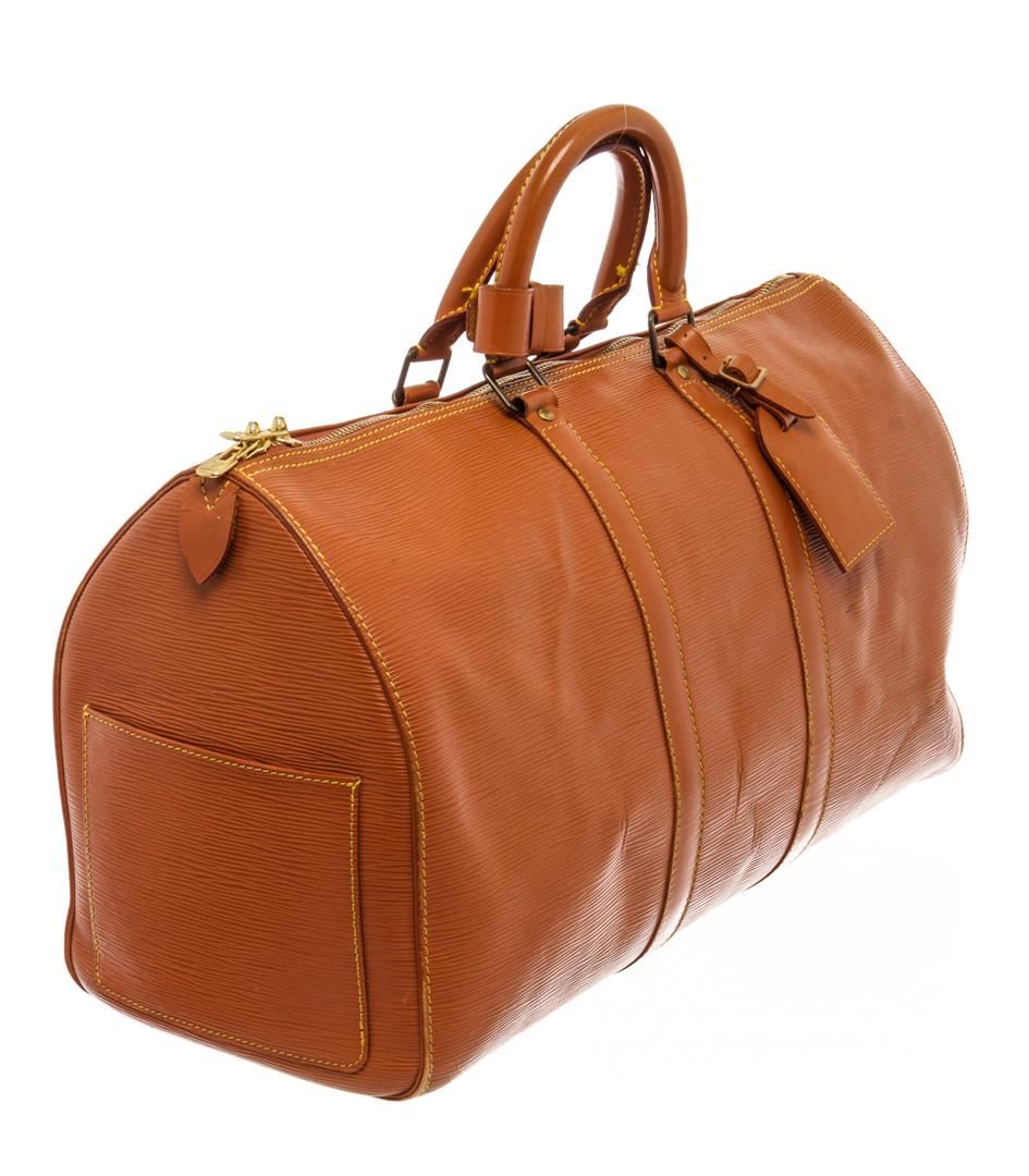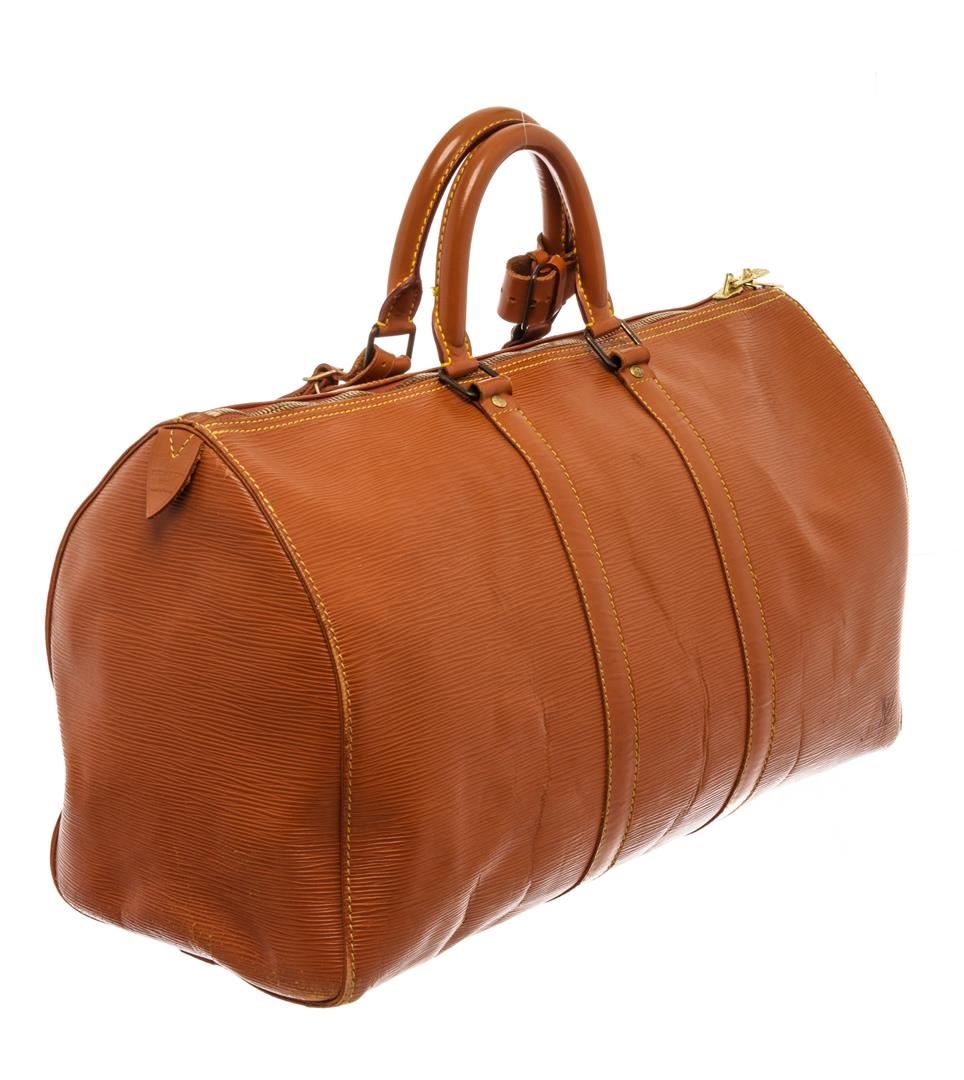 Louis Vuitton Keepall 50 Boston Bag. Brand: Louis Vuitton, Style: Keepall 50, Type: Boston Bag, Exterior color: Brown Epi, Exterior material: Leather, Interior color: Brown, Interior material: Suede, Length: 19.7, Width: 8.7, Height: 11.4. Item is sold AS