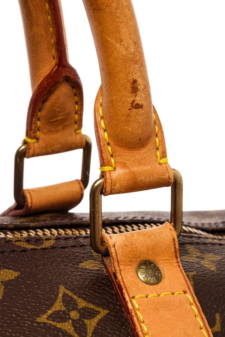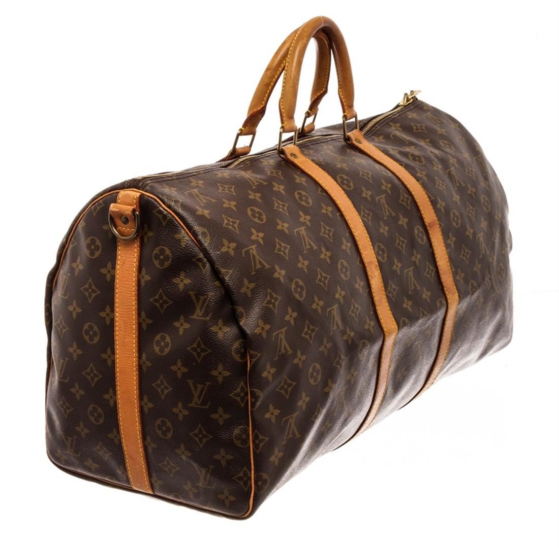 Louis Vuitton Keepall 55 Bandouliere Travel Bag Monogram Coated Canvas. Brand: Louis Vuitton, Style: Keepall 55 Bandouliere, Type: Travel Bag, Exterior Color: Monogram, Exterior Material: Coated Canvas, Interior Color: Brown, Interior Material: Canvas, Closure: Zip closure, Handle/Strap Type: Dual rolled handles, Length: 22, Width: 12, Height: 1N/A, Handle Drop: 5. Condition: Wear on piping. Item is sold AS-IS and all information pertaining to this lot is available in the photos or this description.