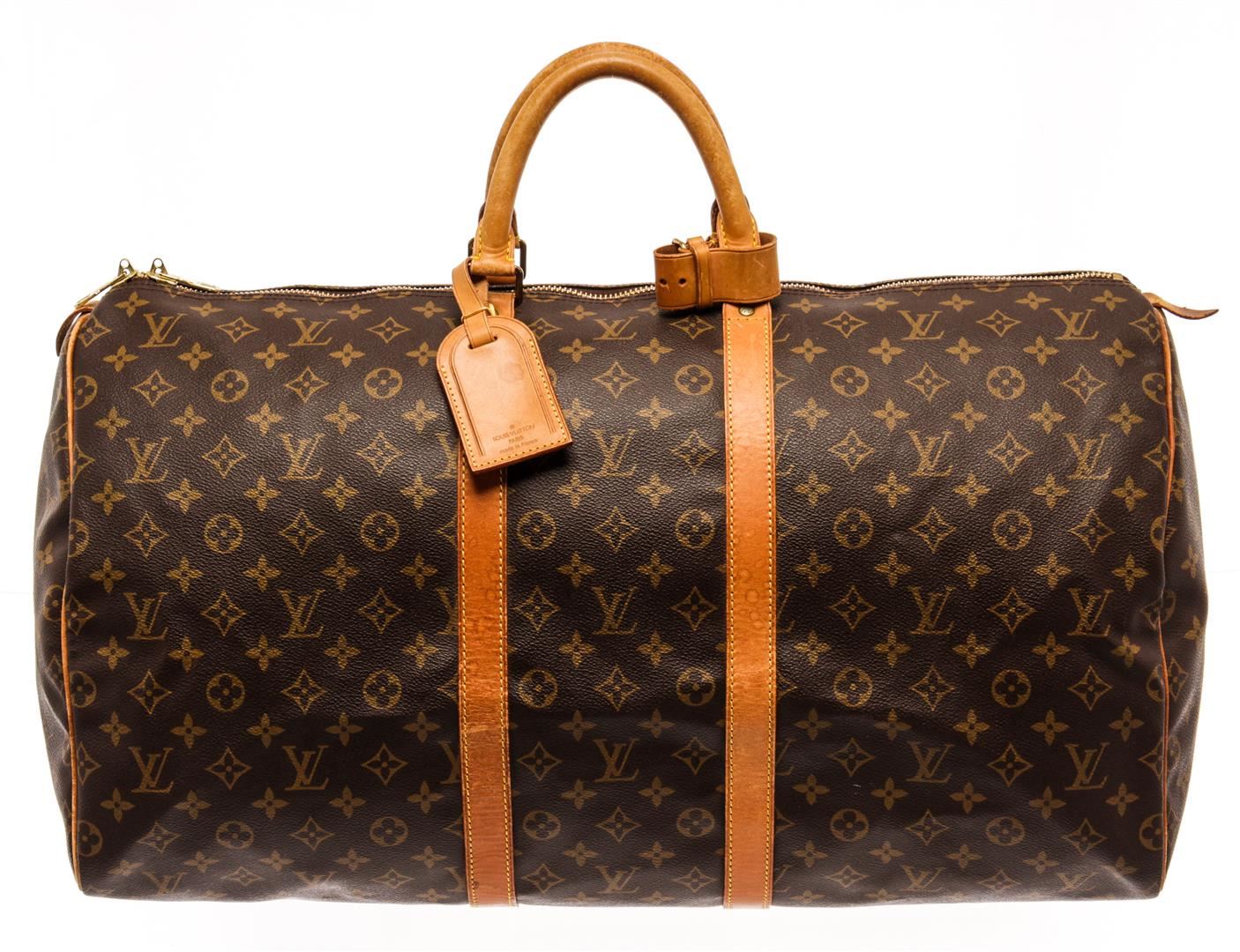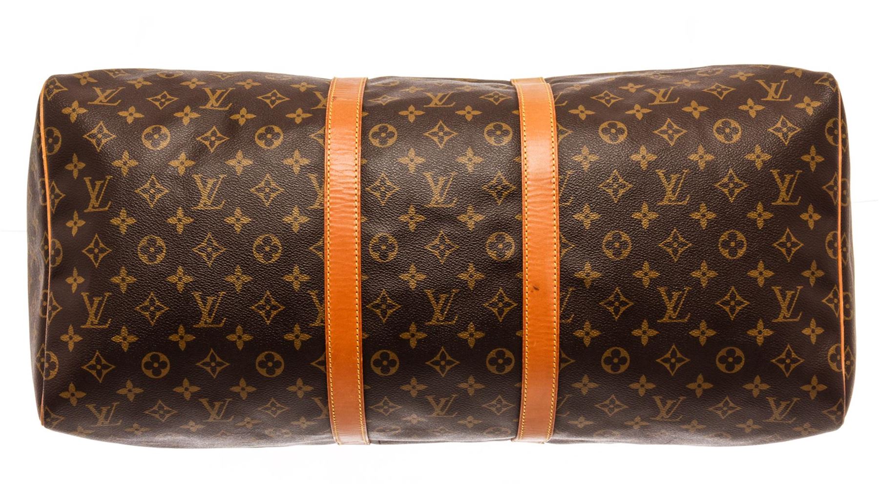 Louis Vuitton Keepall 55 Duffle Bag Brown Monogram Coated Canvas. Brand: Louis Vuitton, Style: Keepall 55, Type: Duffle Bag, Exterior Color: Brown Monogram, Exterior Material: Coated Canvas, Exterior Pockets: None, Interior Color: Brown, Interior Material: Canvas, Interior Pockets: One, Closure: Zip, Handle/Strap Type: Top Handle, Length: 9, Width: 22, Height: 12, Handle Drop: 4. Condition: Vachetta is stained and creased. Item is sold AS-IS and all information pertaining to this lot is available in the photos or this description.