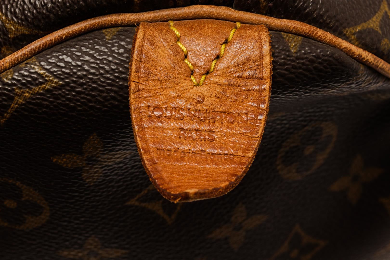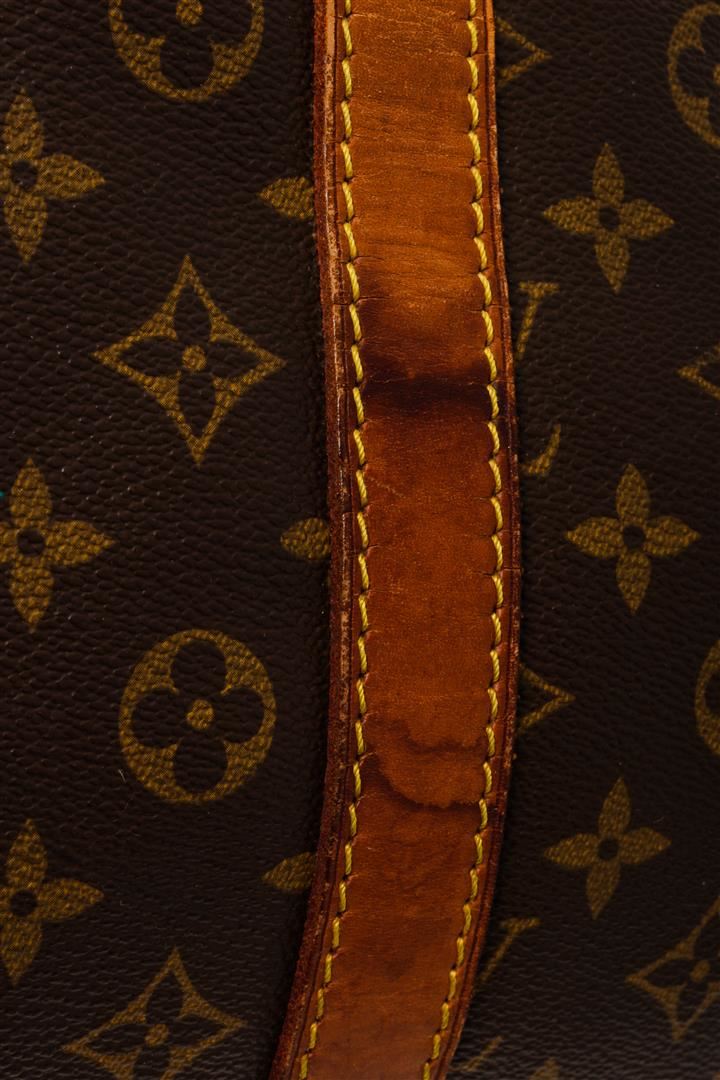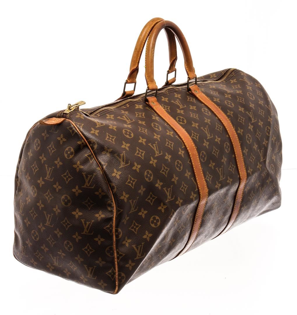 Louis Vuitton Keepall 55 Duffle Bag. Brand: Louis Vuitton, Style: Keepall 55, Type: Duffle Bag, Exterior color: Brown Monogram, Exterior material: Coated Canvas, Interior color: Brown, Interior material: Canvas, Length: 21, Width: 9.25, Height: 12.5. Item