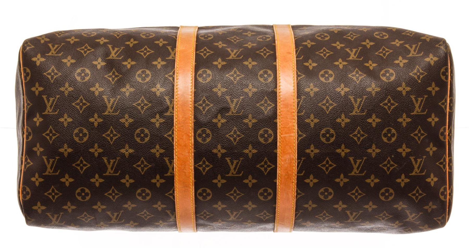 Louis Vuitton Keepall 55 Duffle Bag. Brand: Louis Vuitton, Style: Keepall 55, Type: Duffle Bag, Exterior color: Brown Monogram, Exterior material: Coated Canvas, Interior color: Brown, Interior material: Canvas, Length: 22, Width: 9, Height: 12. Item is s