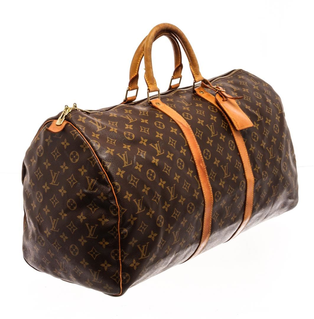 Louis Vuitton Keepall 55 Duffle Bag. Brand: Louis Vuitton, Style: Keepall 55, Type: Duffle Bag, Exterior color: Brown Monogram, Exterior material: Coated Canvas, Interior color: Brown, Interior material: Canvas, Length: 9, Width: 22, Height: 12. Item is s
