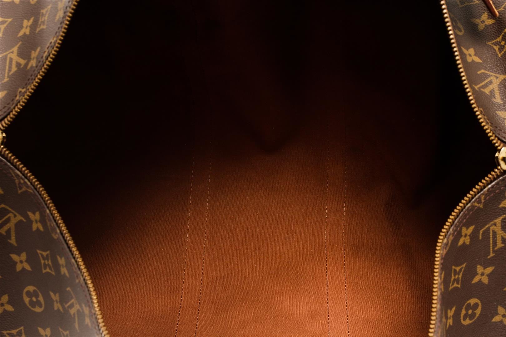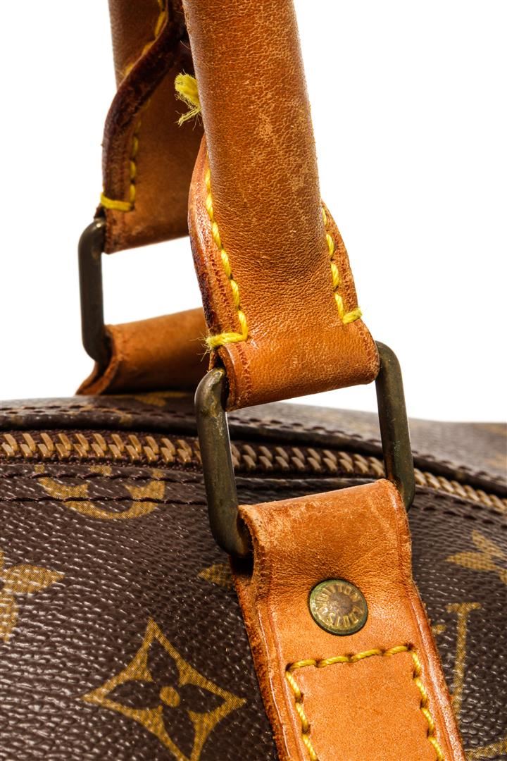 One Louis Vuitton Keepall 55 cm Duffel Bag. Item is sold AS-IS. All available information is listed in the description and shown in the photo. Louis Vuitton Keepall 55 cm duffel bag with monogram coated canvas exterior, contrasting vanchetta leather trims and top handles, top zipper closure, gold-tone hardware, brown fabric lining, and luggage tag.