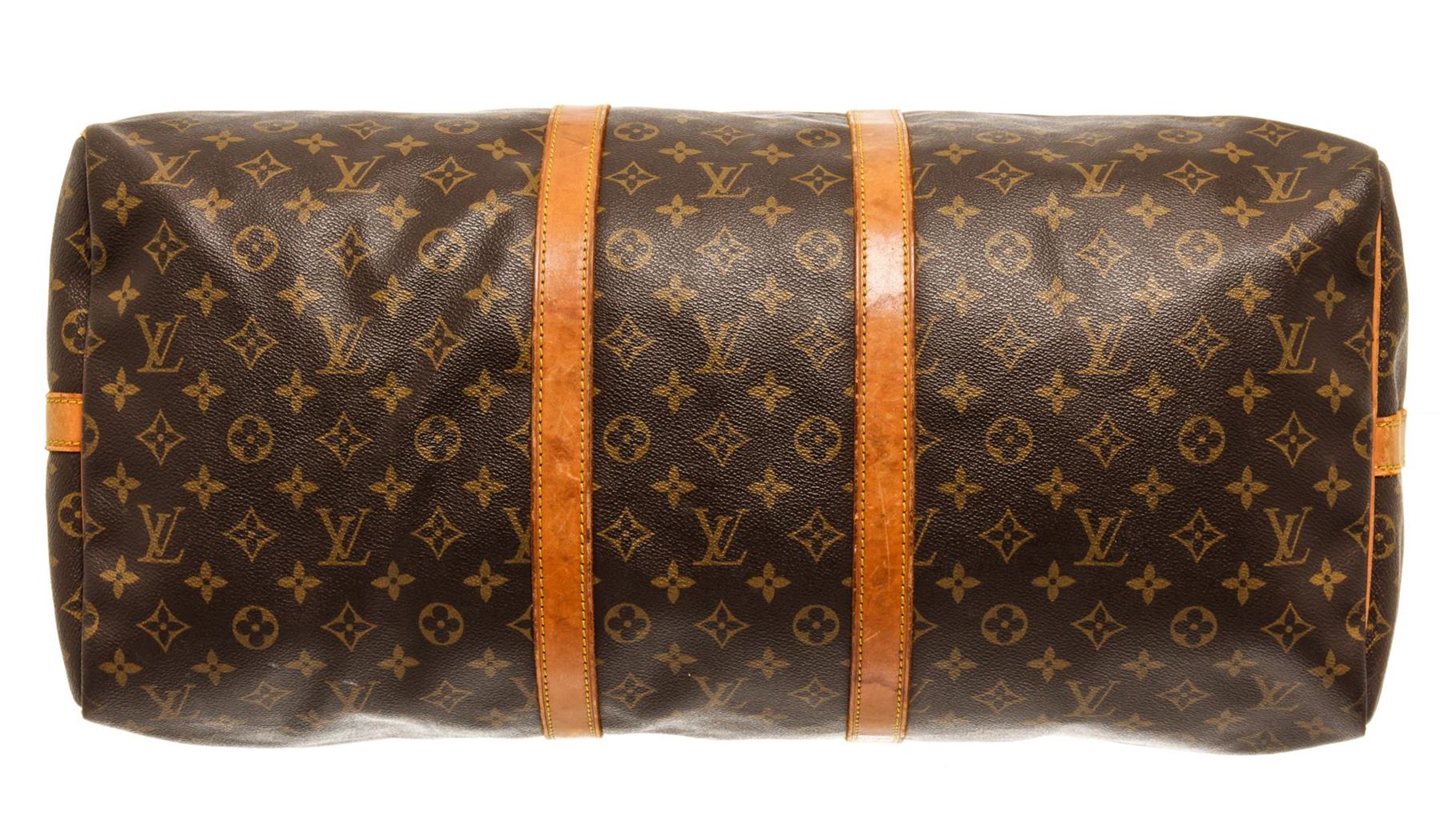 One Louis Vuitton Keepall 55 cm Duffel Bag. Item is sold AS-IS. All available information is listed in the description and shown in the photo. Louis Vuitton Keepall 55 cm duffel bag with monogram coated canvas exterior, contrasting vanchetta leather trims and top handles, top zipper closure, gold-tone hardware, brown fabric lining, and luggage tag.