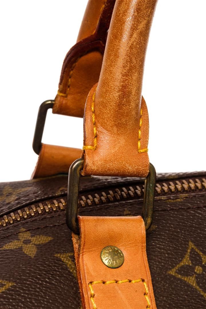 Louis Vuitton Keepall 60 Duffle Bag Brown Monogram Coated Canvas. Brand: Louis Vuitton, Style: Keepall 60, Type: Duffle Bag, Exterior Color: Brown Monogram, Exterior Material: Coated Canvas, Exterior Pockets: None, Interior Color: Brown, Interior Material: Canvas, Interior Pockets: One, Closure: Zip, Handle/Strap Type: Dual rolled handles, Length: 24, Width: 1N/A, Height: 13, Handle Drop: 4. Condition: Brand tag has black mark. Item is sold AS-IS and all information pertaining to this lot is available in the photos or this description.