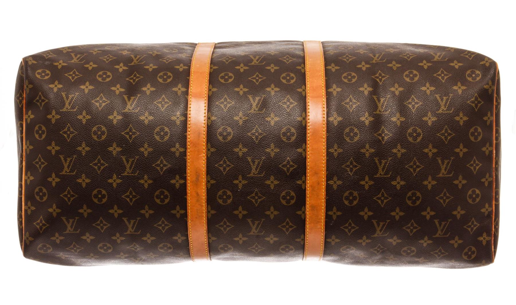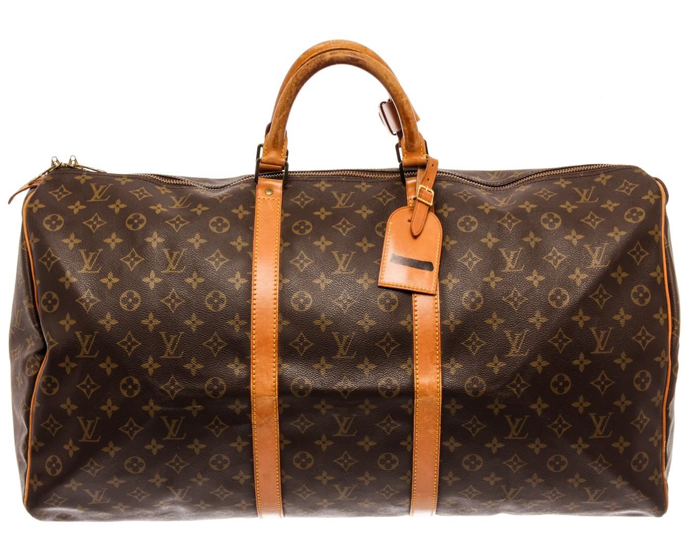 Louis Vuitton Keepall 60 Duffle Bag. Brand: Louis Vuitton, Style: Keepall 60, Type: Duffle Bag, Exterior color: Brown Monogram, Exterior material: Coated Canvas, Interior color: Brown, Interior material: Canvas, Length: 24, Width: 10, Height: 13. Item is