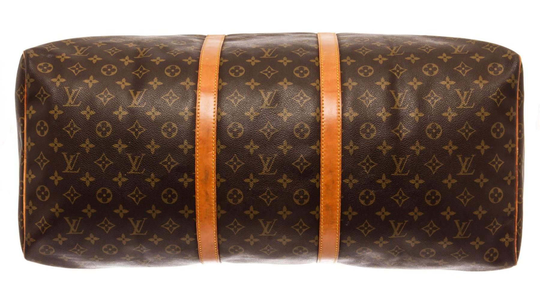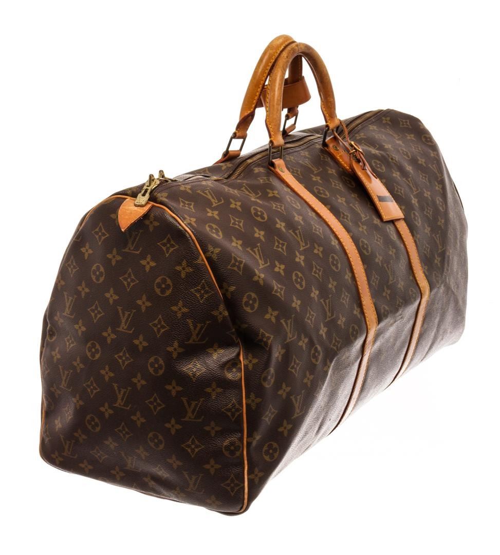 Louis Vuitton Keepall 60 Duffle Bag. Brand: Louis Vuitton, Style: Keepall 60, Type: Duffle Bag, Exterior color: Brown Monogram, Exterior material: Coated Canvas, Interior color: Brown, Interior material: Canvas, Length: 24, Width: 10, Height: 13. Item is