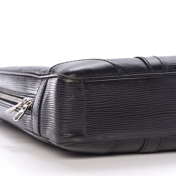 Black document briefcase is crafted of Louis Vuitton signature textured epi leather. The bag features smooth rolled leather top handles with silver links, and a wrap-around zipper. This opens to a black fabric interior with room for a laptop.